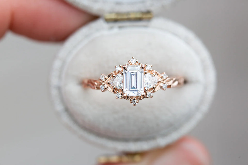 Customize your own Briar Rose Three Stone with 6x4mm emerald cut center