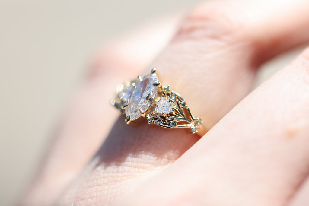 - Woven metal creates a beautiful arch on each side of the ring. My inspiration for this ring stems from gothic cathedrals and Elvish style arch ways. This version of the setting will sit lower on the finger.