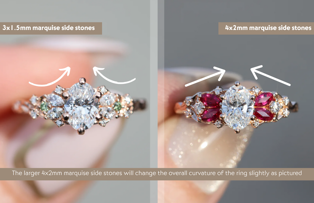- Two, 2mm round stones placed between the marquise side stones