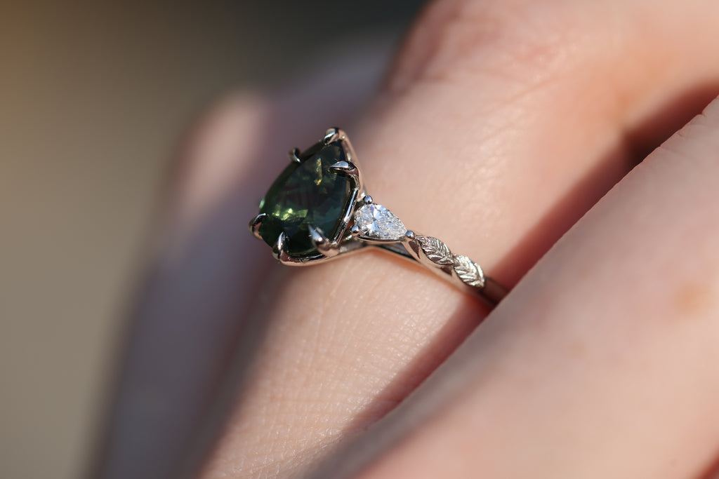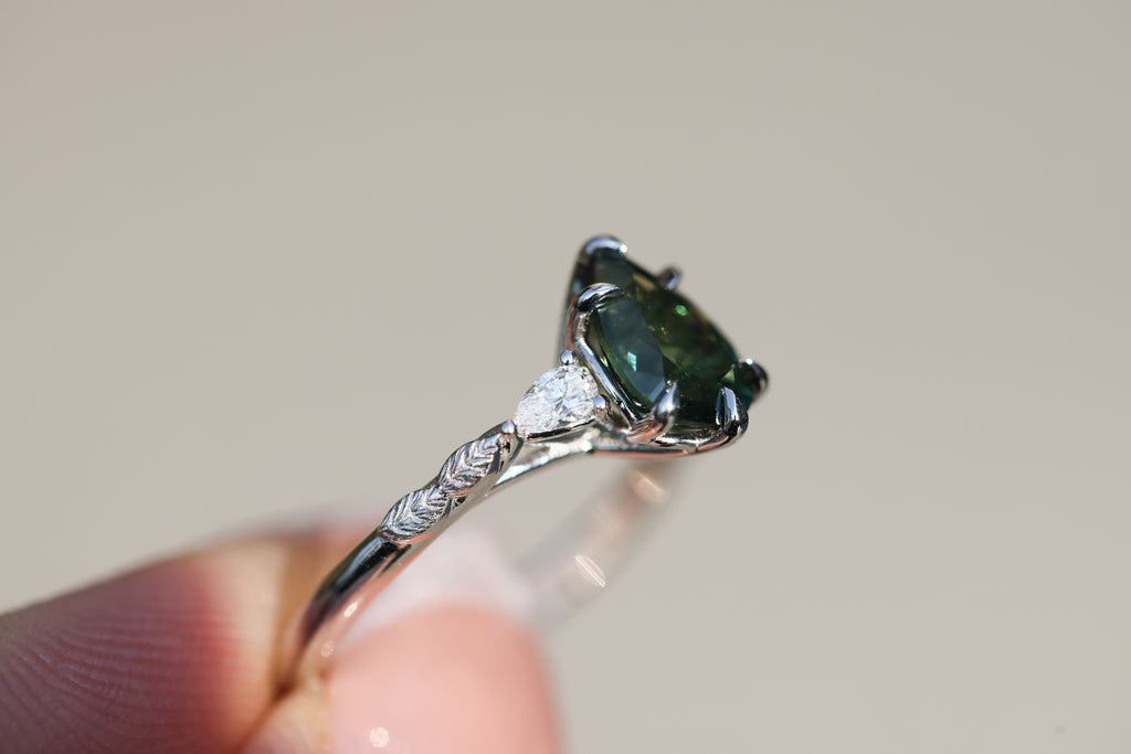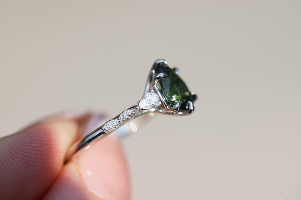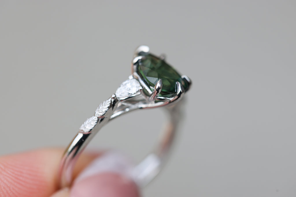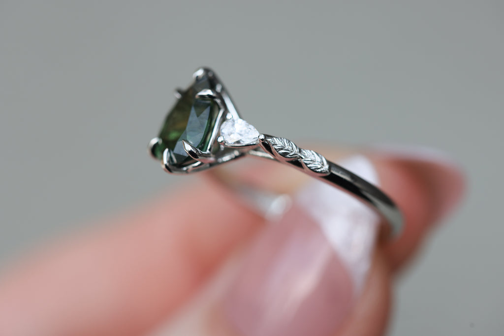 - Small leaves weave down the setting into a smooth band