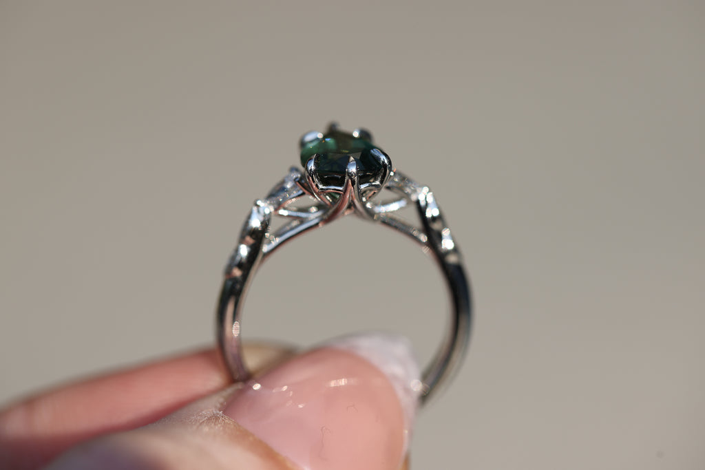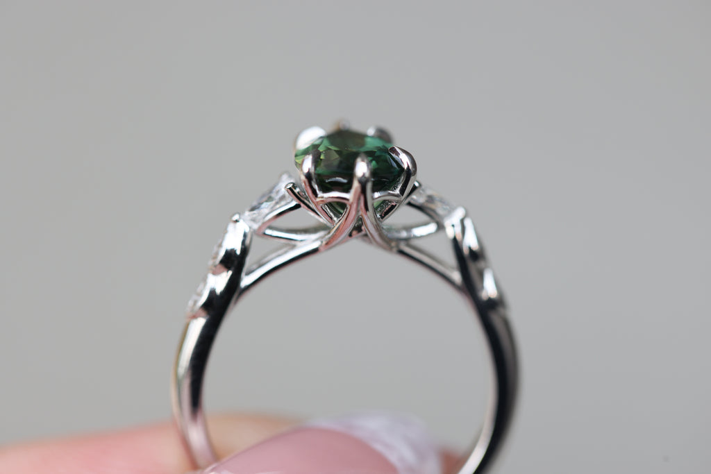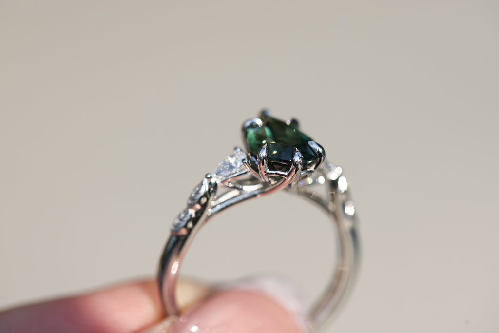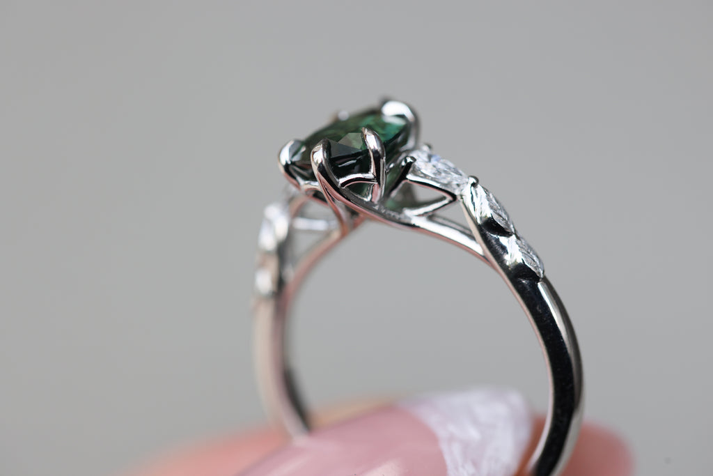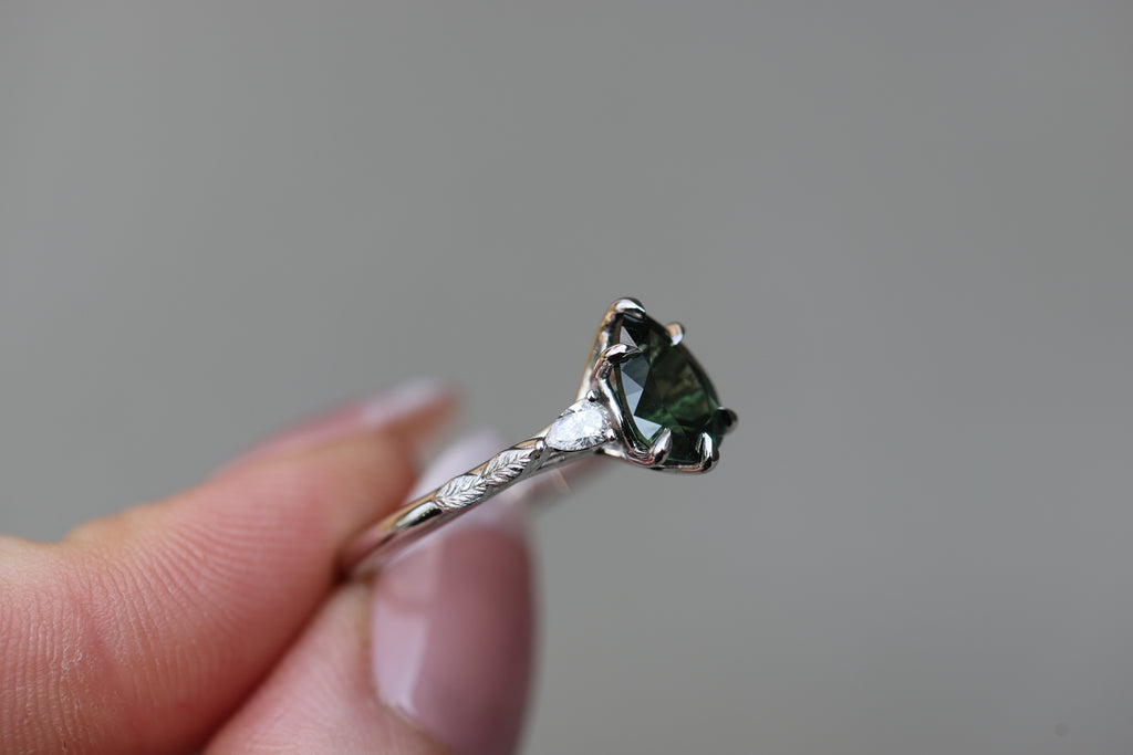 - Small leaves weave down the setting into a smooth band