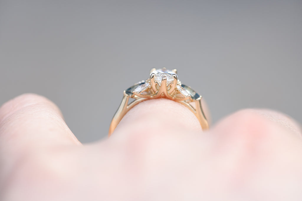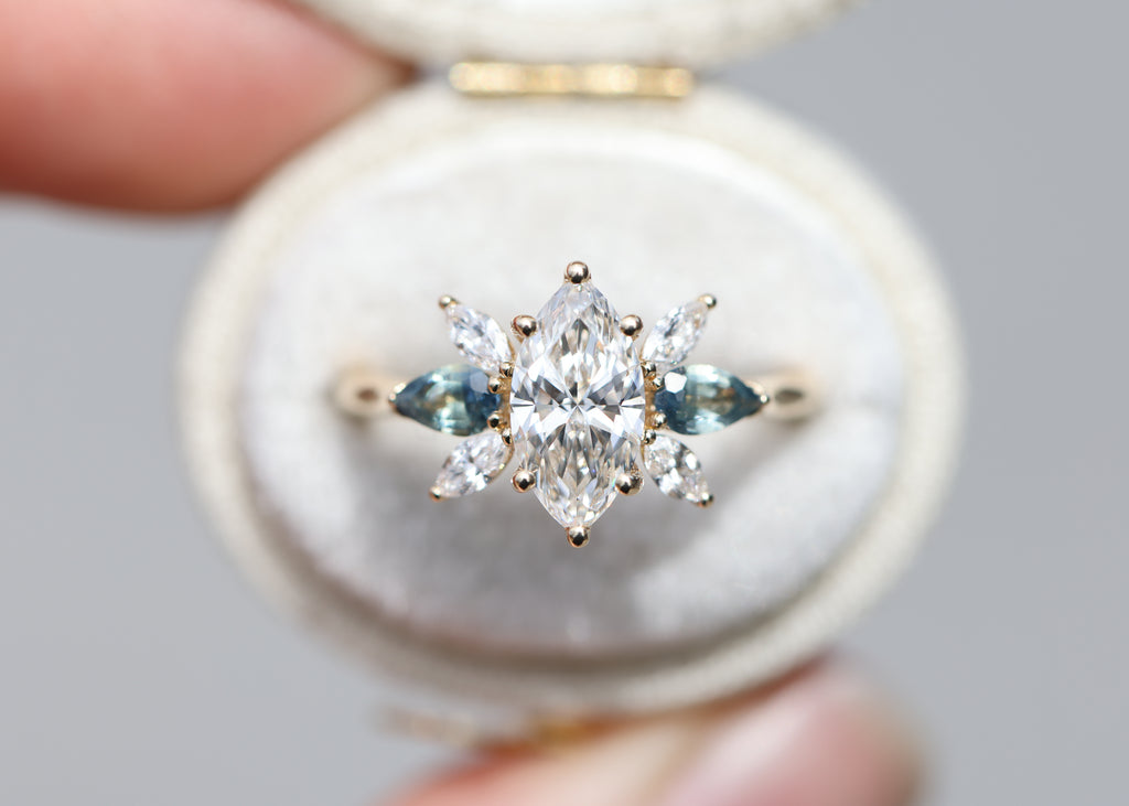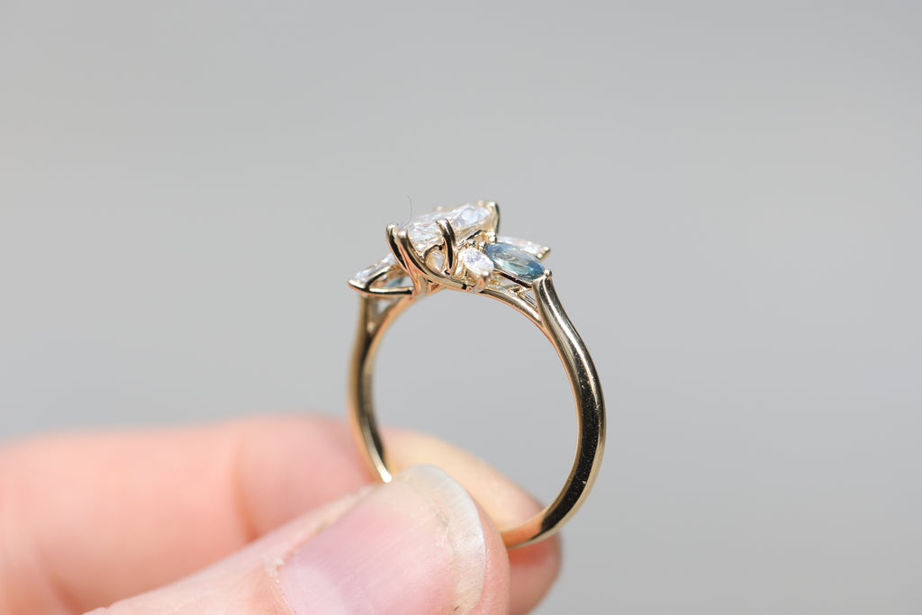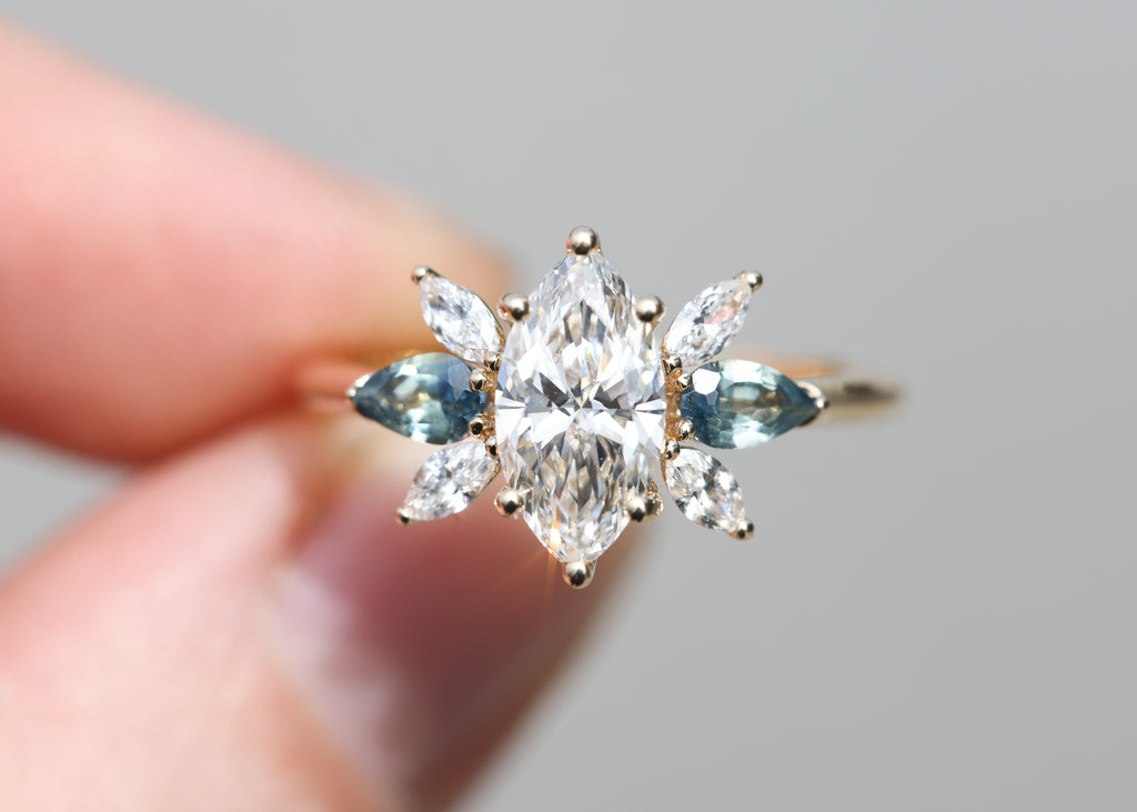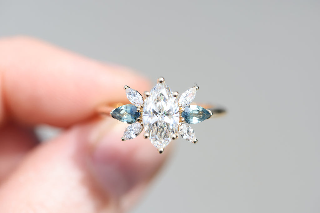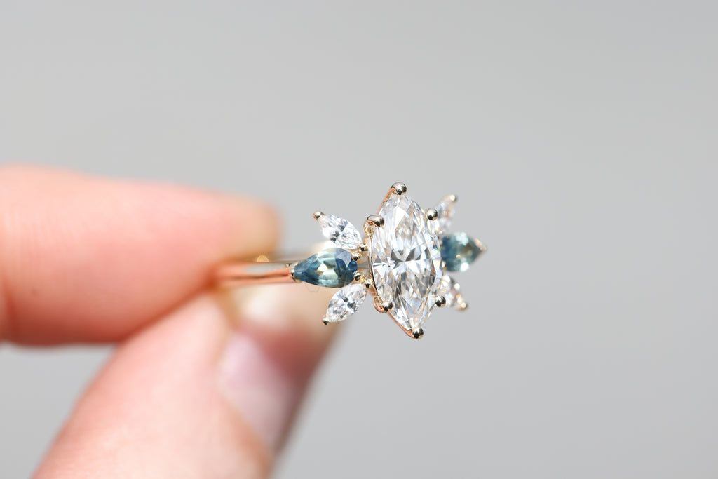 *note: For pear blue teal sapphire side stones I hand pick the side stones and they do vary in color, I have no green ones but I do have some that are more blue teal and some more blue. If you have a preference please let me know but I try my best to pick as matching of a pair as possible. They will not match 100% as each stone is unique and one of a kind.