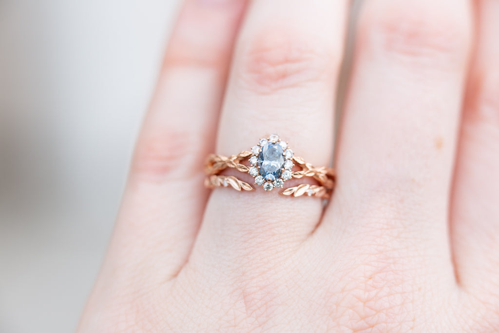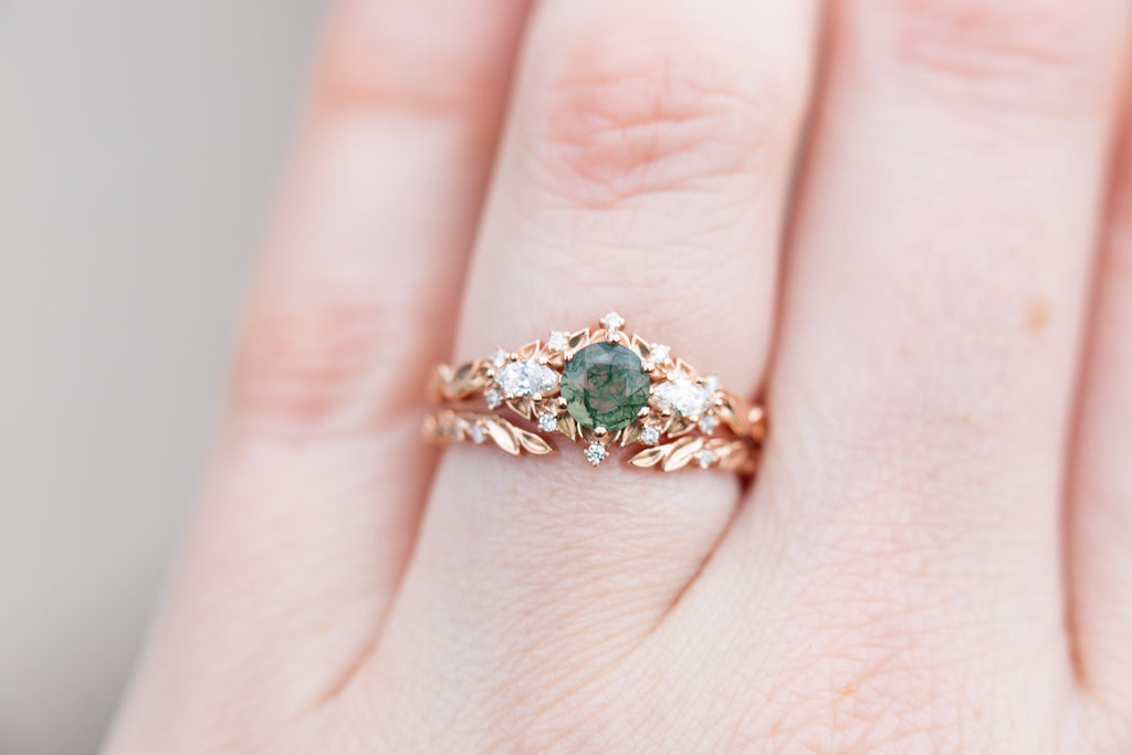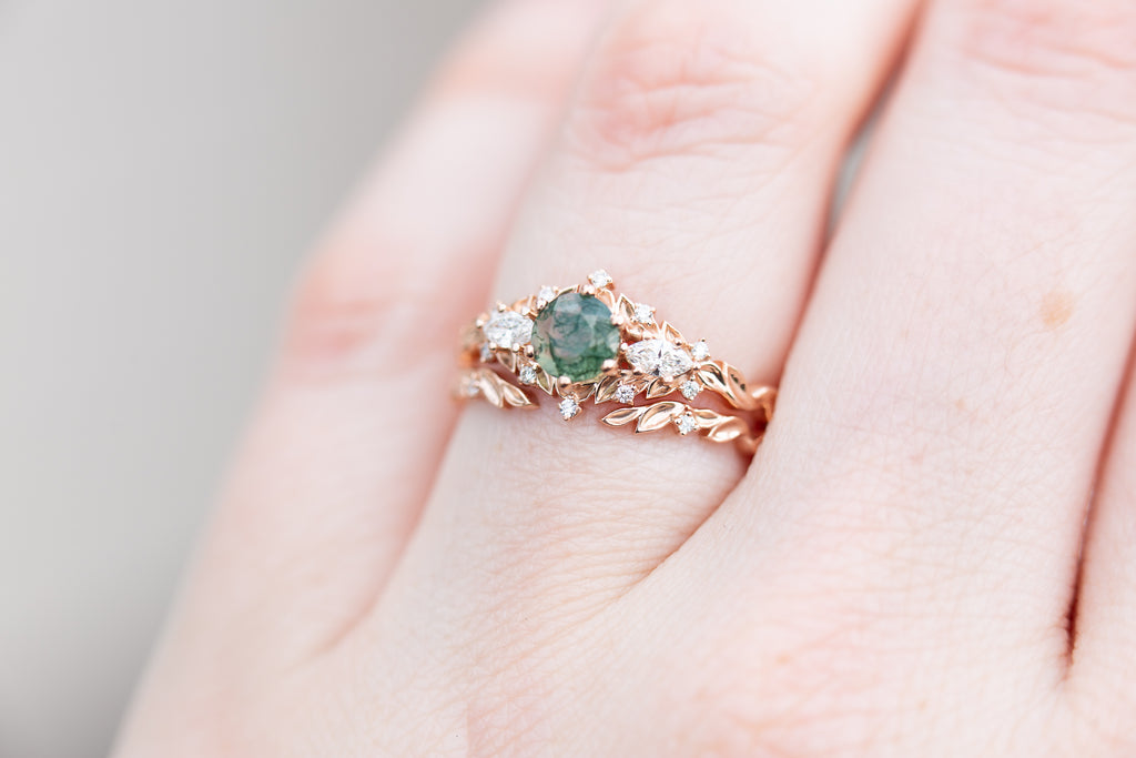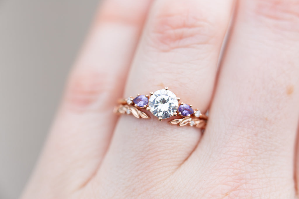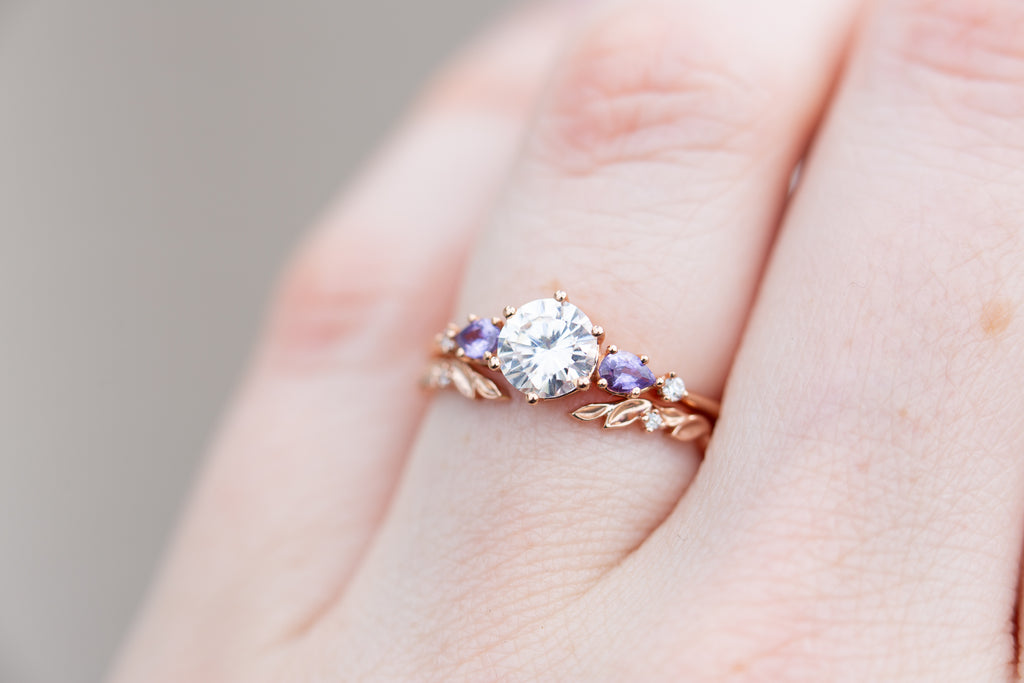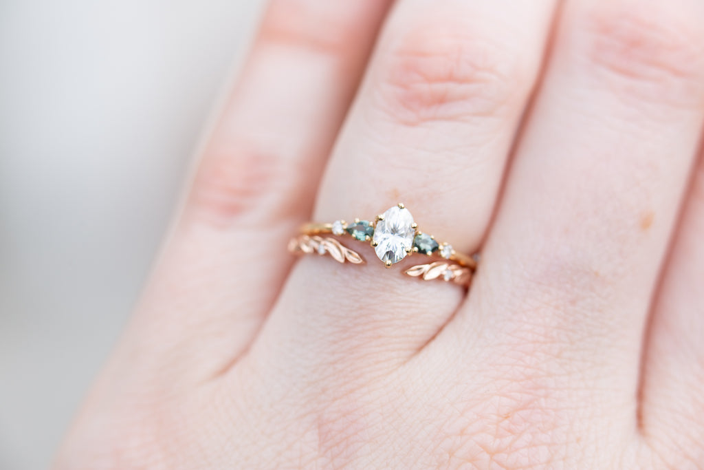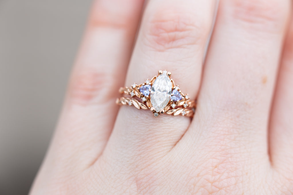 - Two, 1mm stones are place inside the curves of the leaves, giving this ring a little extra sparkle