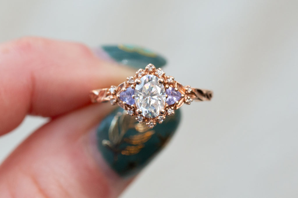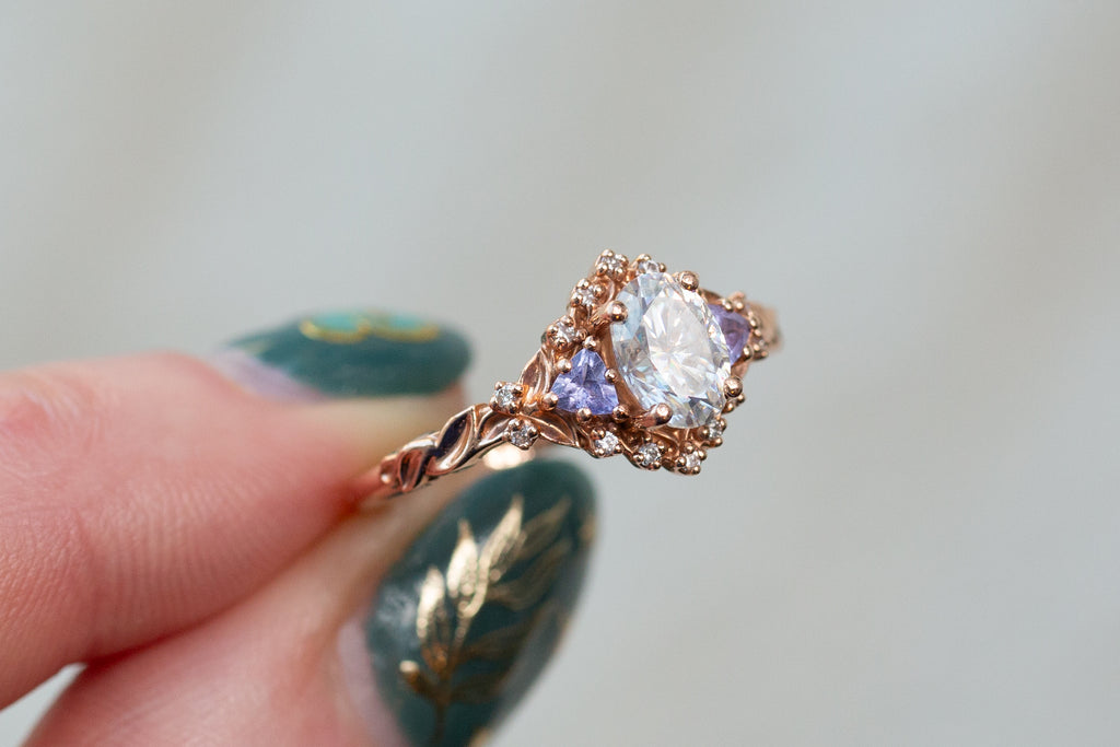 - Side/accent stones: 3mm trillion tanzanite, 1mm lab diamond