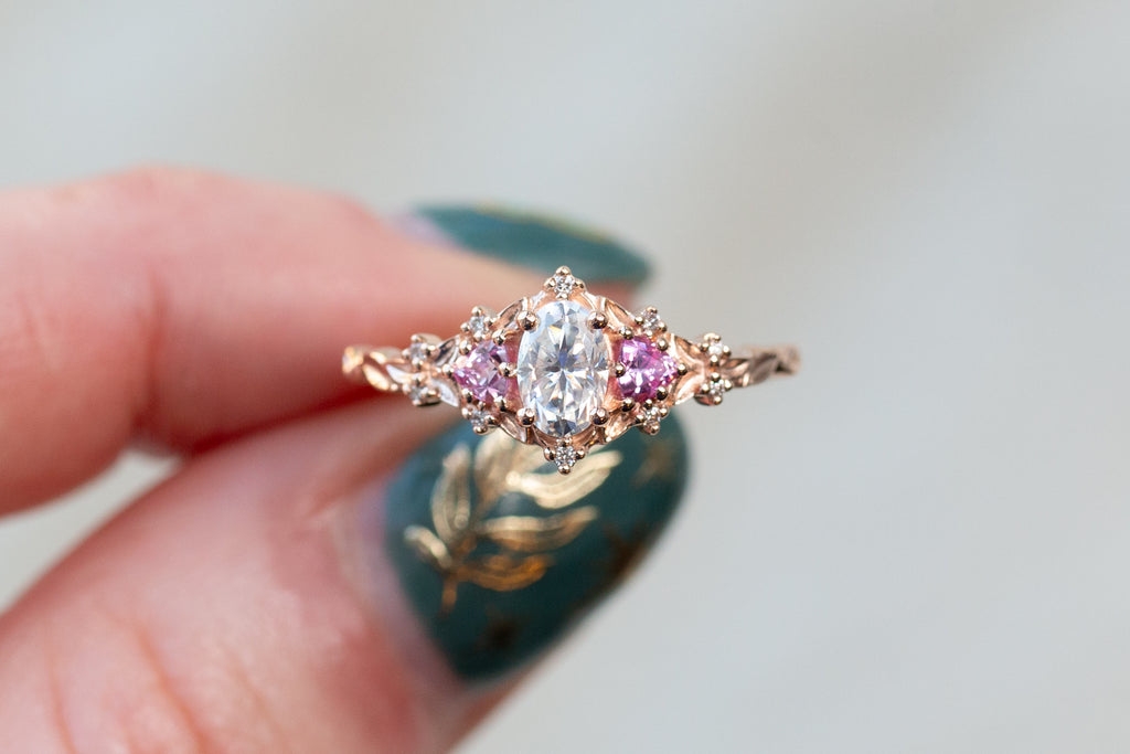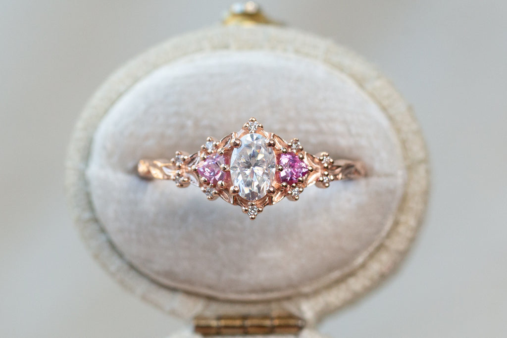 - Side/accent stones: 3mm trillion lab pink sapphire, 1mm lab diamond