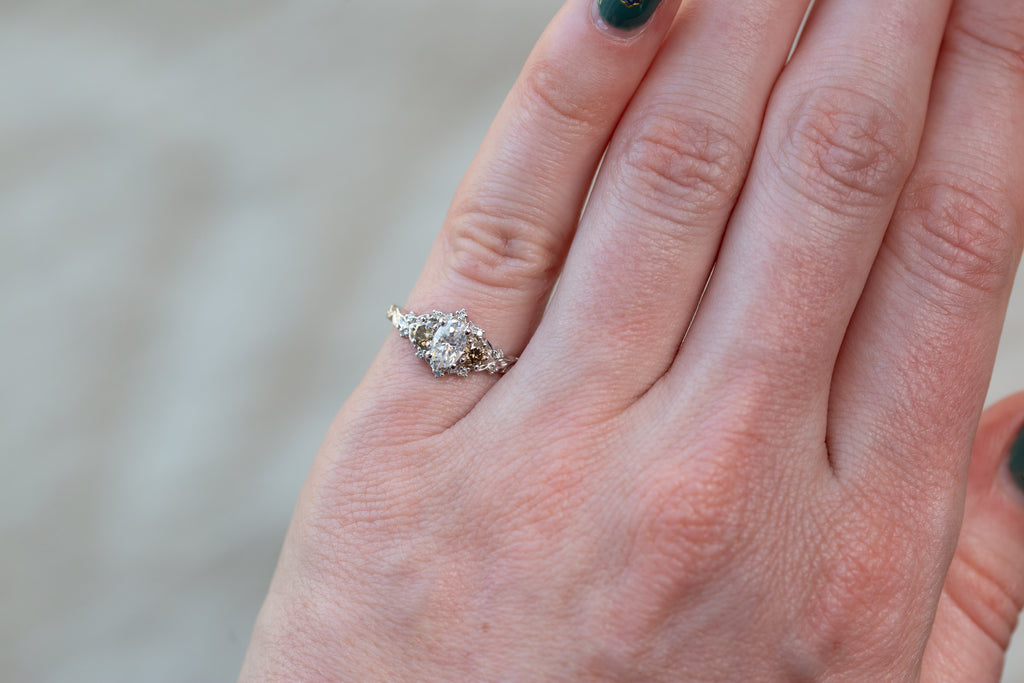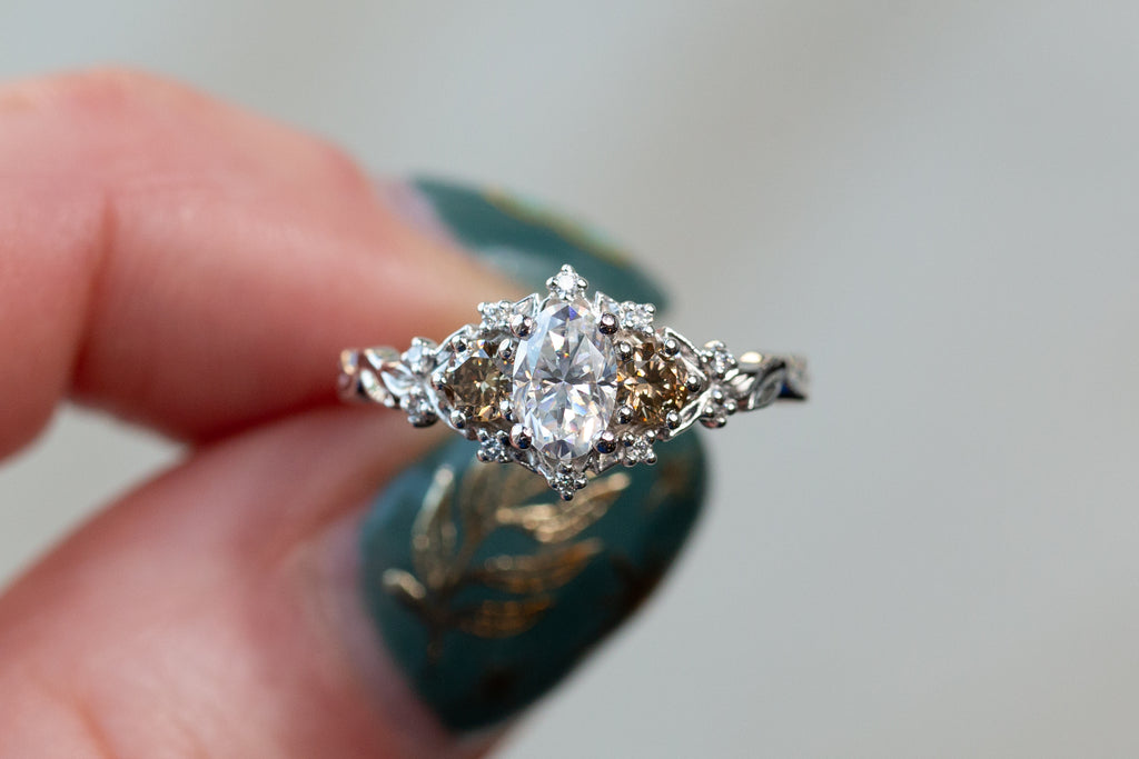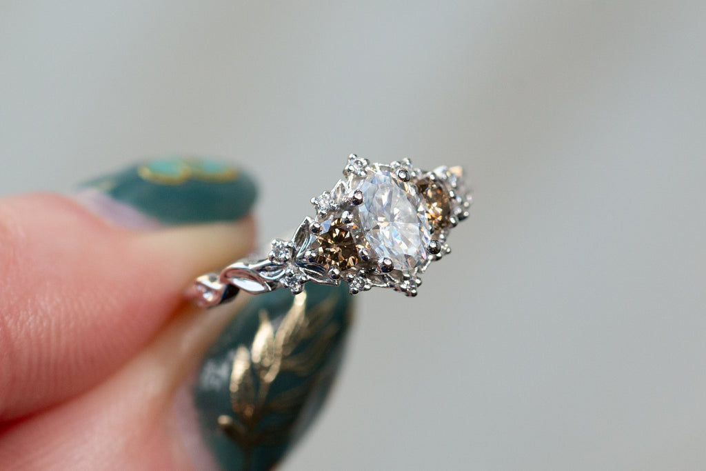 - Side/accent stones: 3mm round champagne diamond, 1mm lab diamond