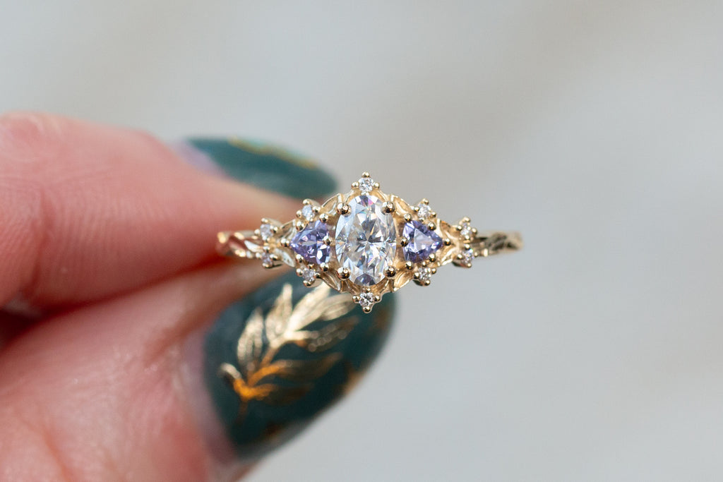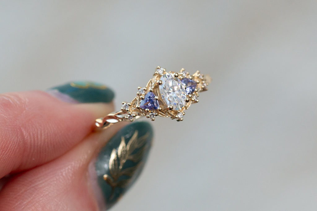 - Side/accent stones: 3mm trillion tanzanite, 1mm lab diamond