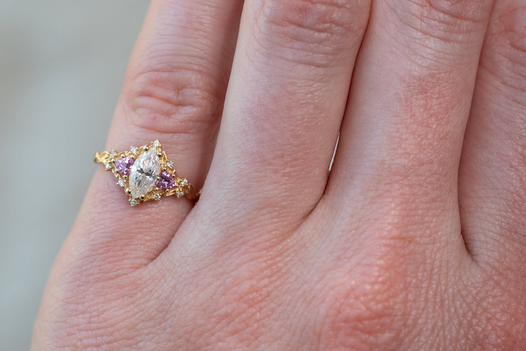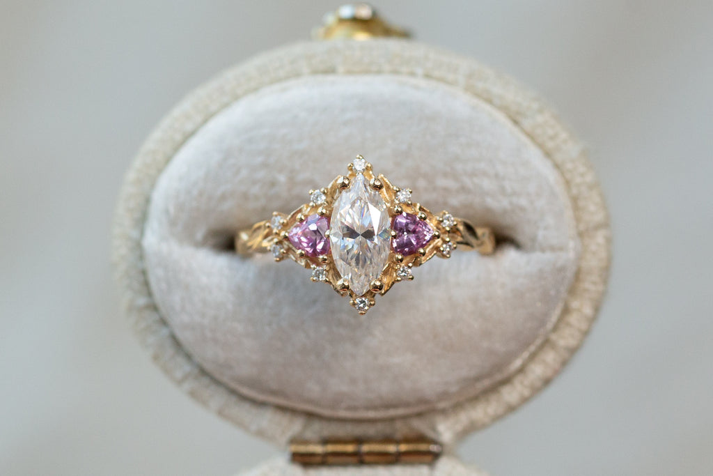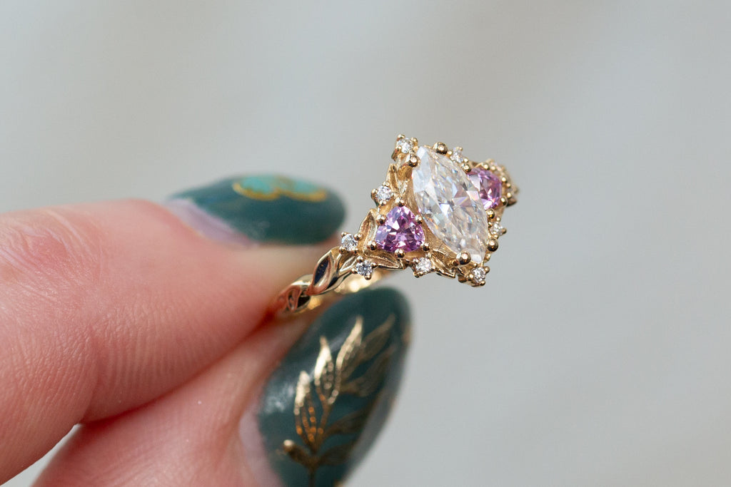 - Side/accent stones: 3mm trillion lab pink sapphire, 1mm lab diamond