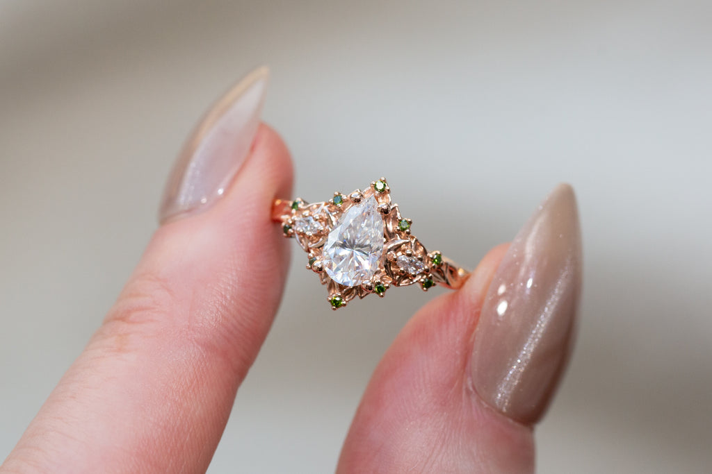 - Side/accents stones: 3x1.5mm marquise lab diamond, 1mm round green diamond