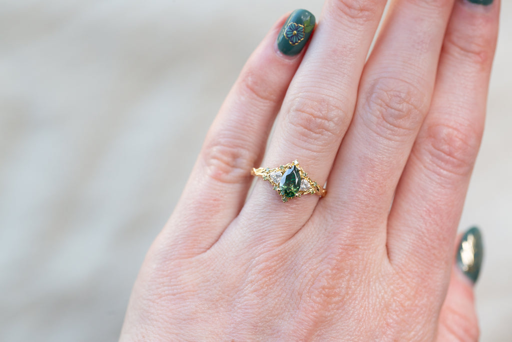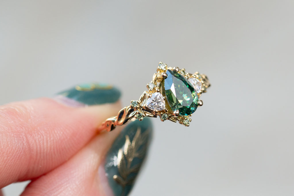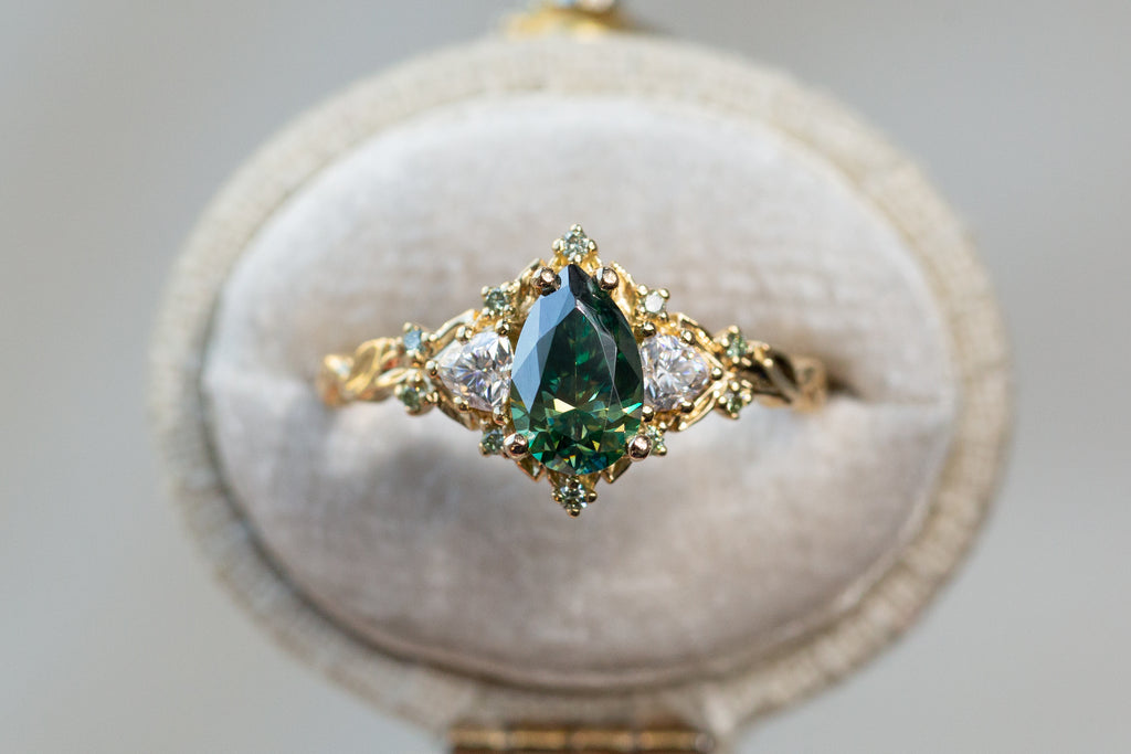 - Side/accent stones: 3mm trillion lab diamond, 1mm mint diamond