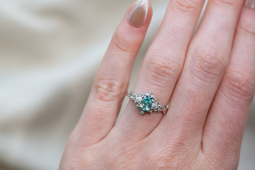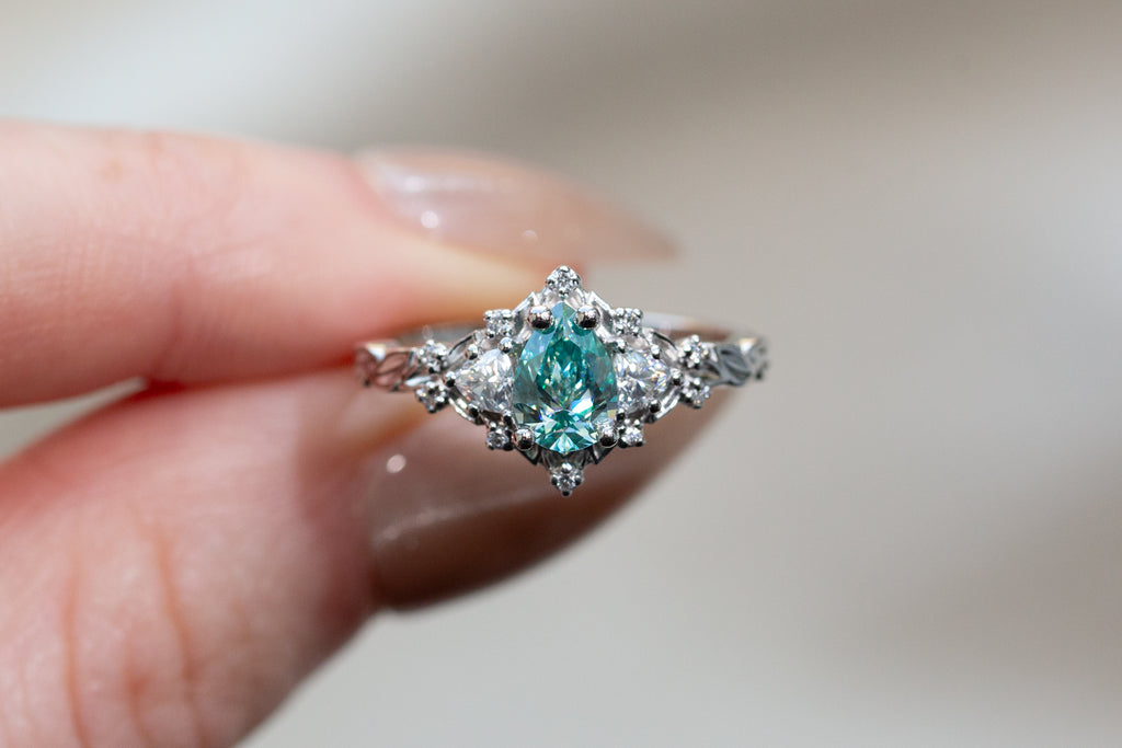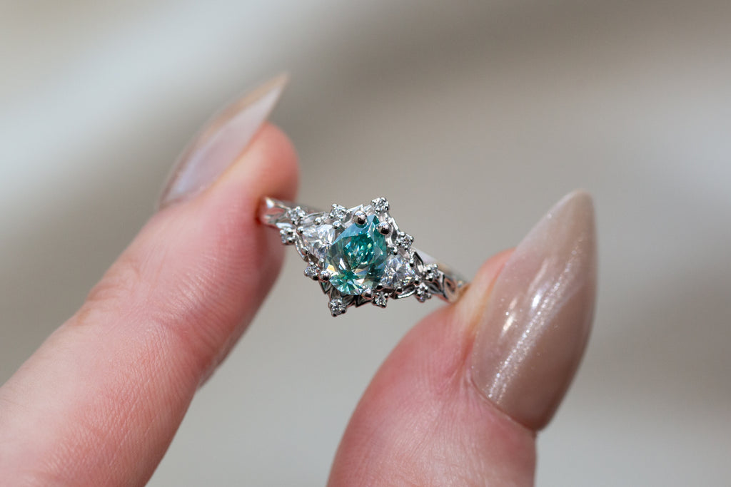 - Side/accent stones: 3mm trillion moissanite, 1mm round lab diamond