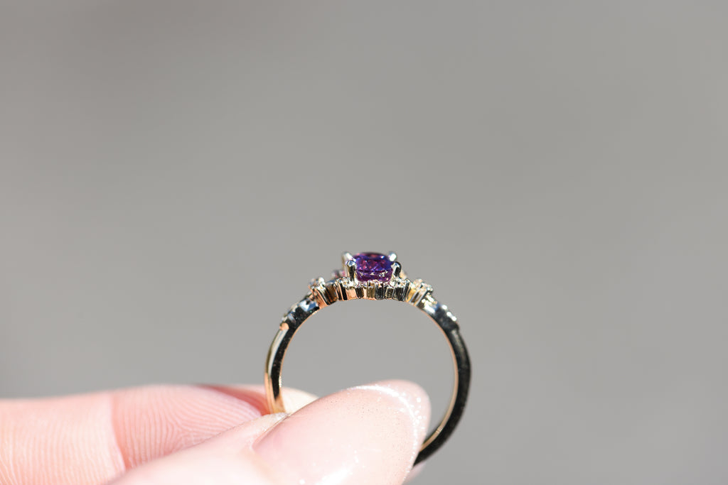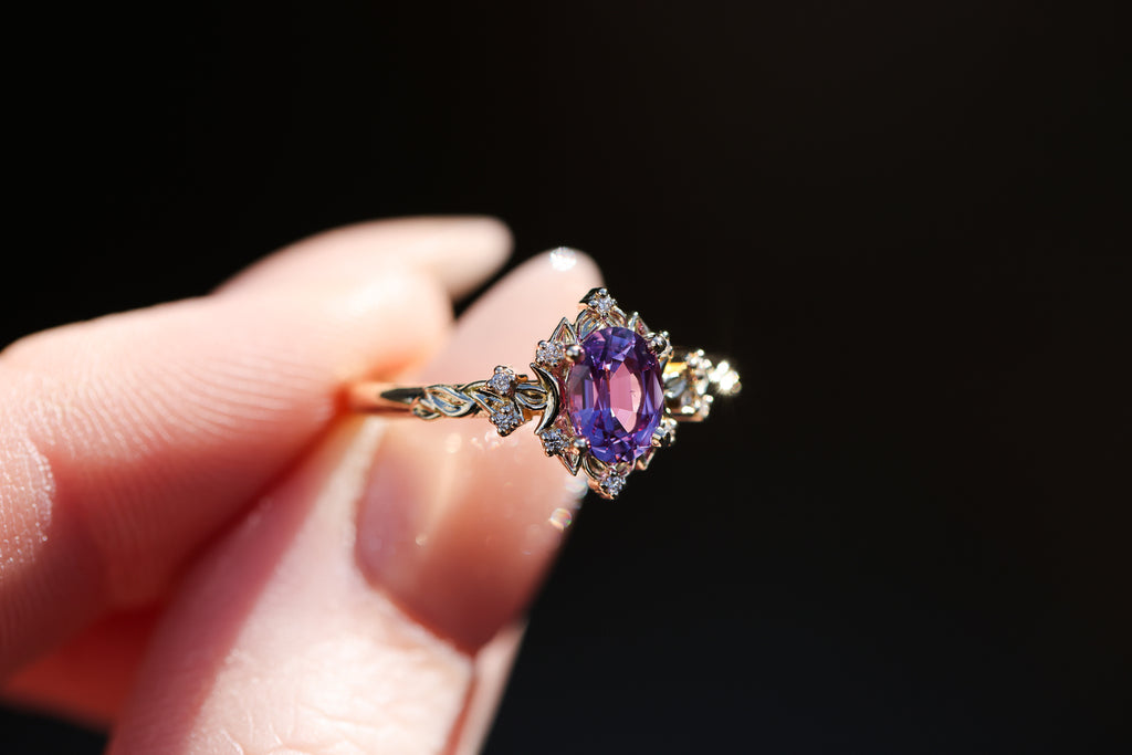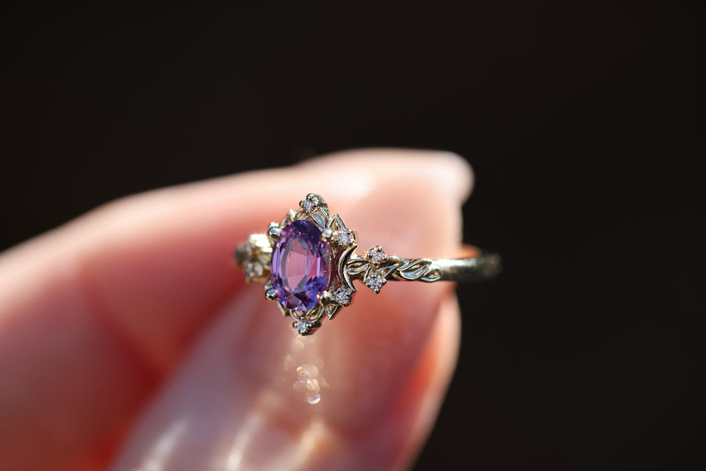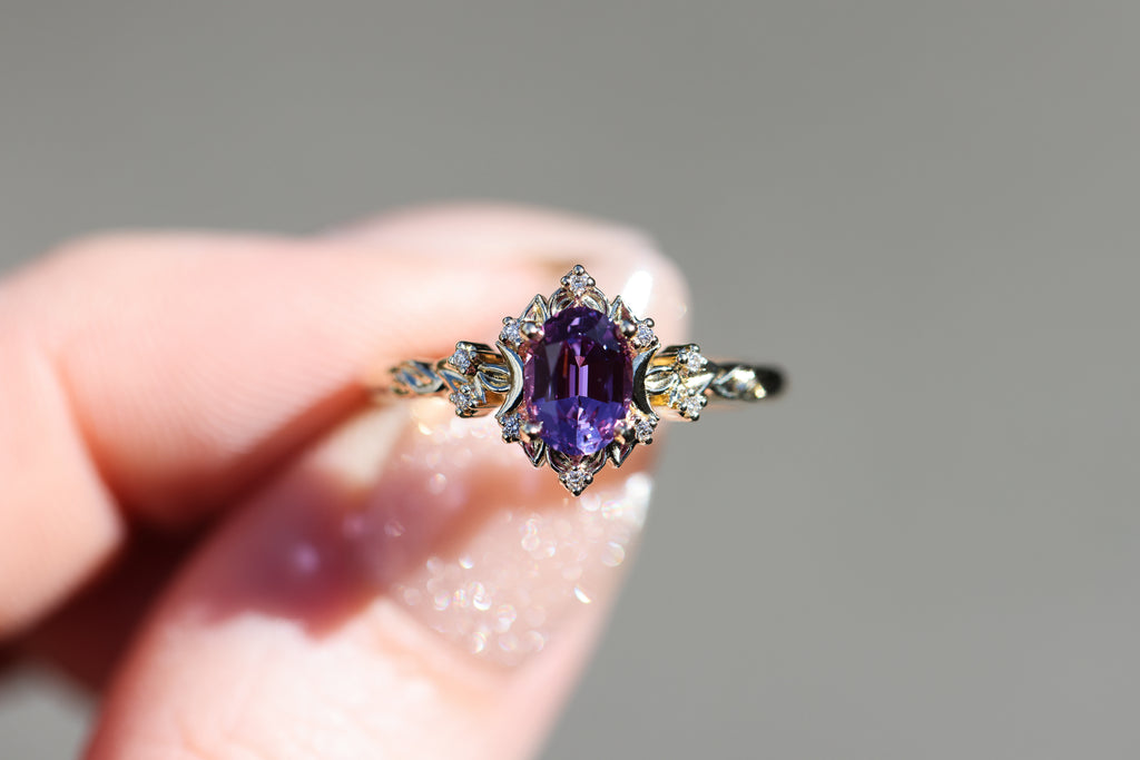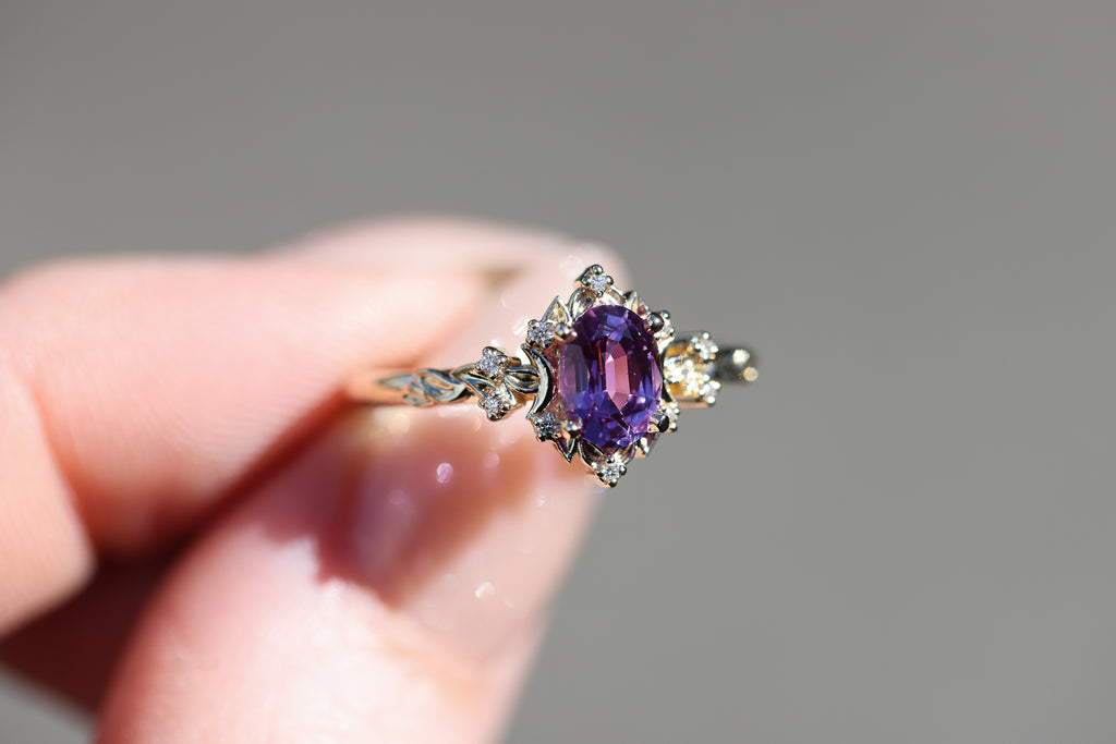 - Center stone: .98ct oval purple sapphire from truthseeker gems