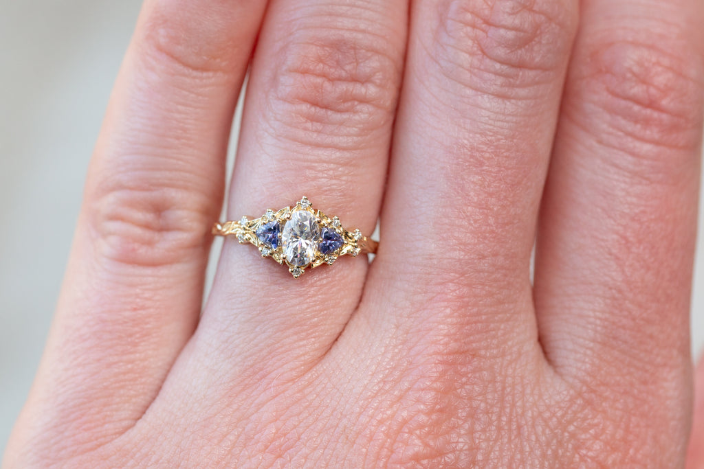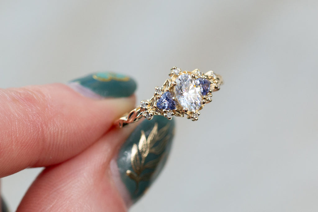 - Side/accent stones: 3mm trillion tanzanite, 1mm lab diamond