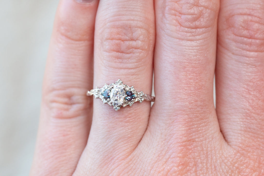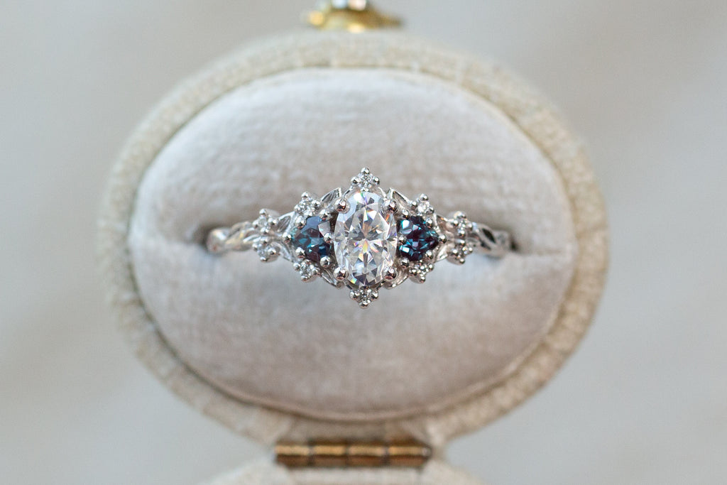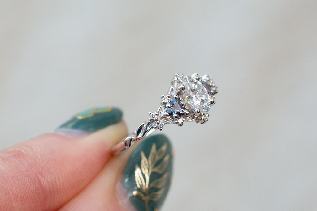 - Side/accent stones: 3mm trillion alexandrite, 1mm lab diamond