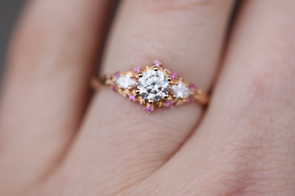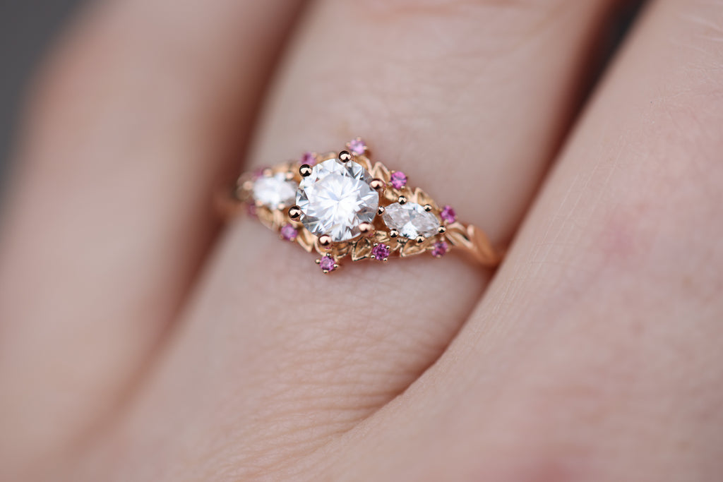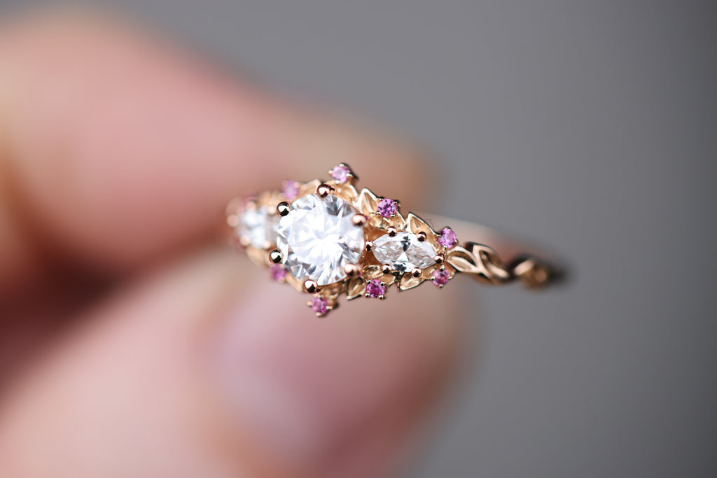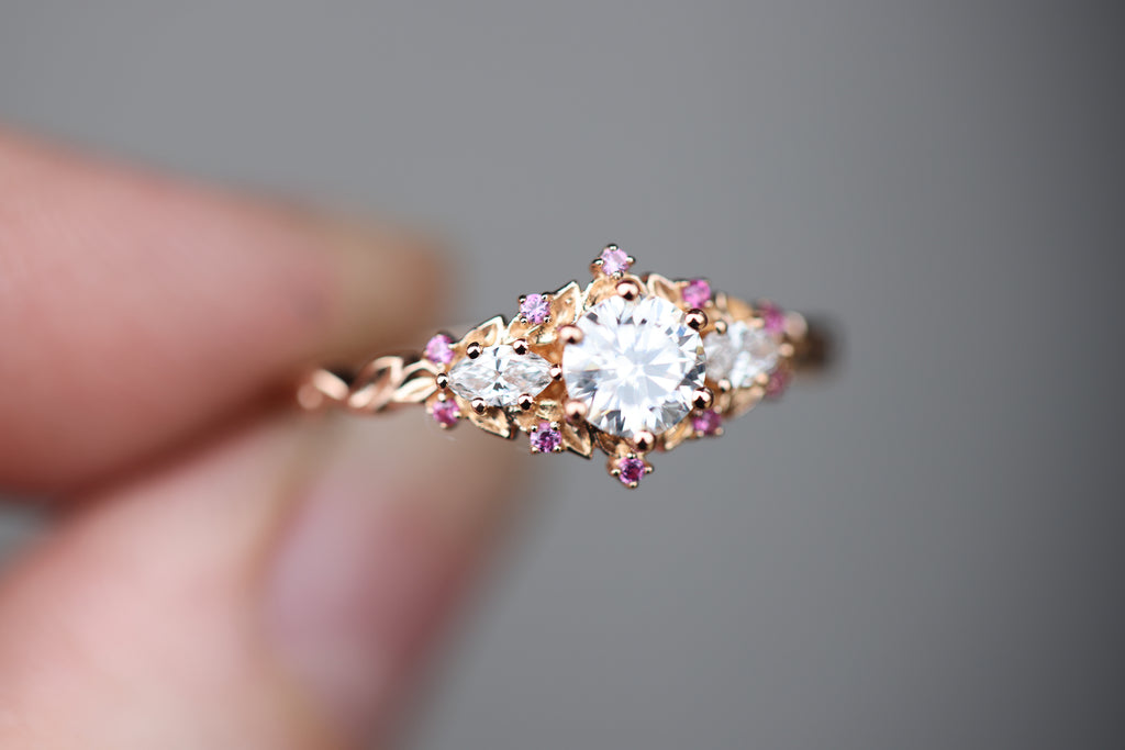 - 1mm pink sapphire accents placed along the leaves