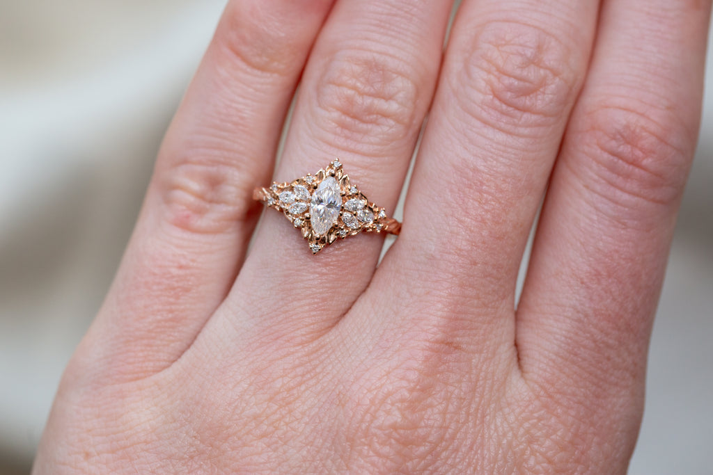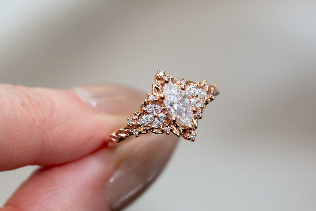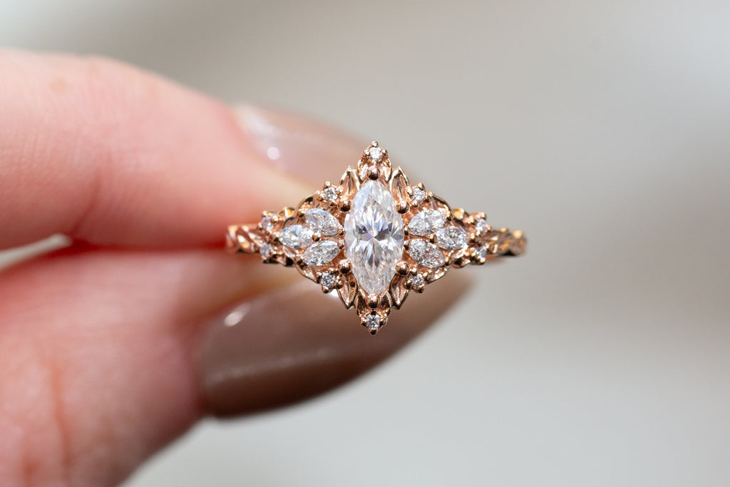 - Side/accents stones: 3x1.5mm marquise lab diamond, 1mm round lab diamond