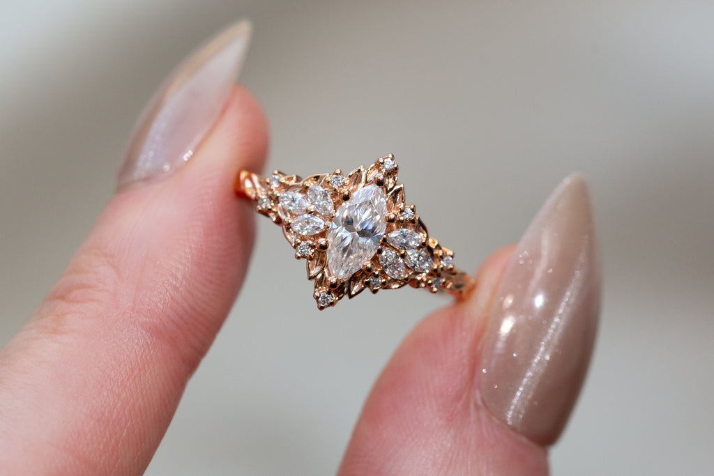 - Center stone: 8x4mm marquise moissanite