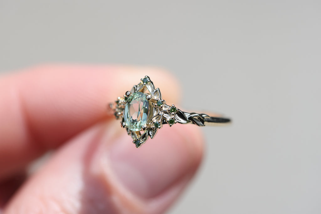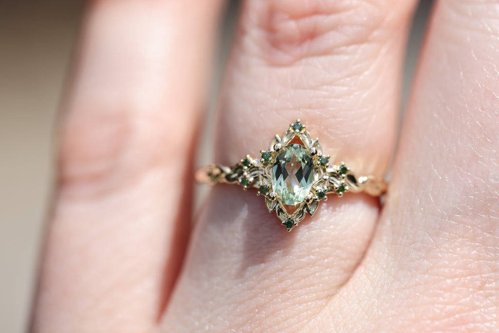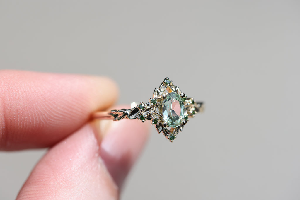 Ready to Ship, Size 7 14k yellow, Briar halo lab green sapphire
