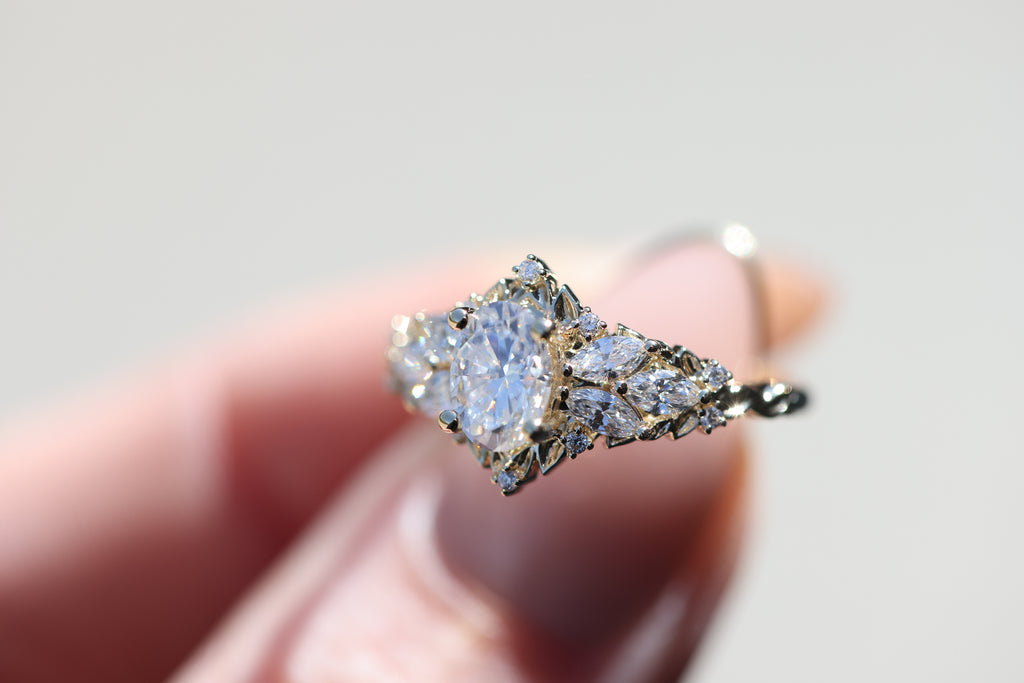 -Side/Accent Stones: 4x2mm marquise, 1mm round accents, all lab diamond
