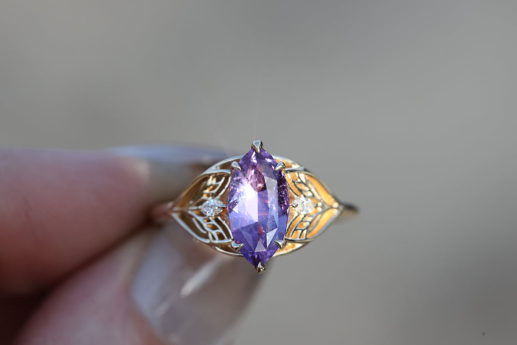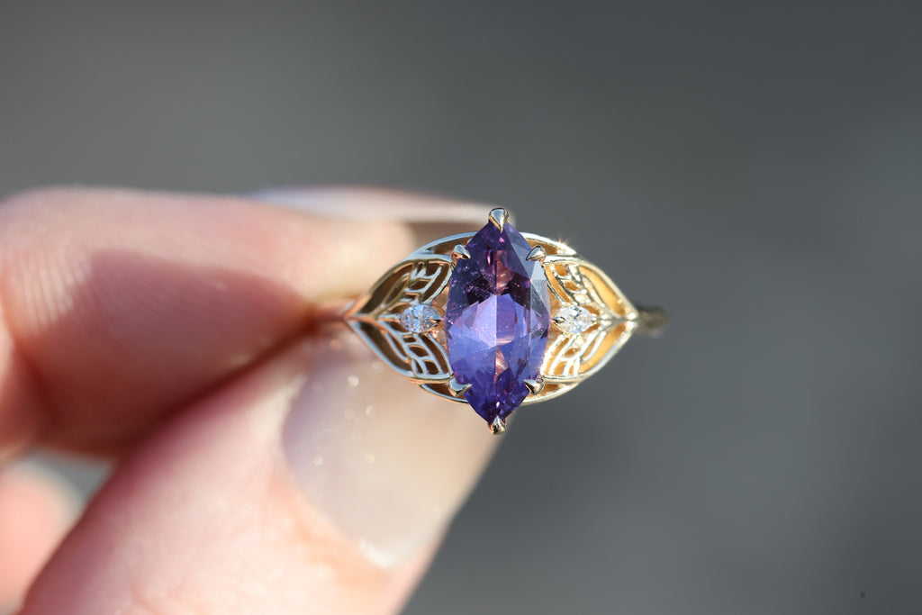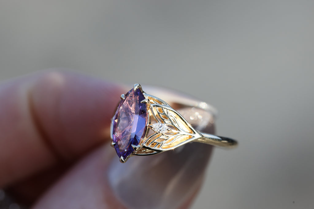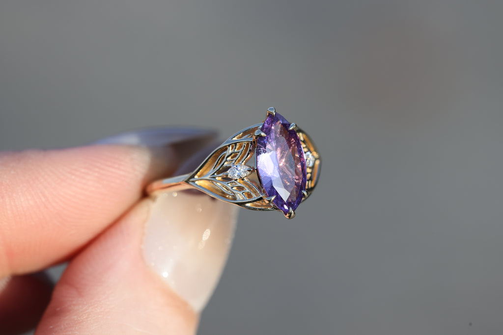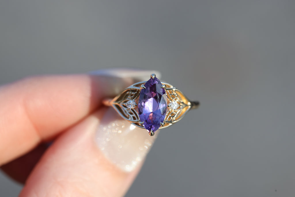 Ready to ship, Size 7 14k yellow Elvindell three stone with marquise purple sapphire