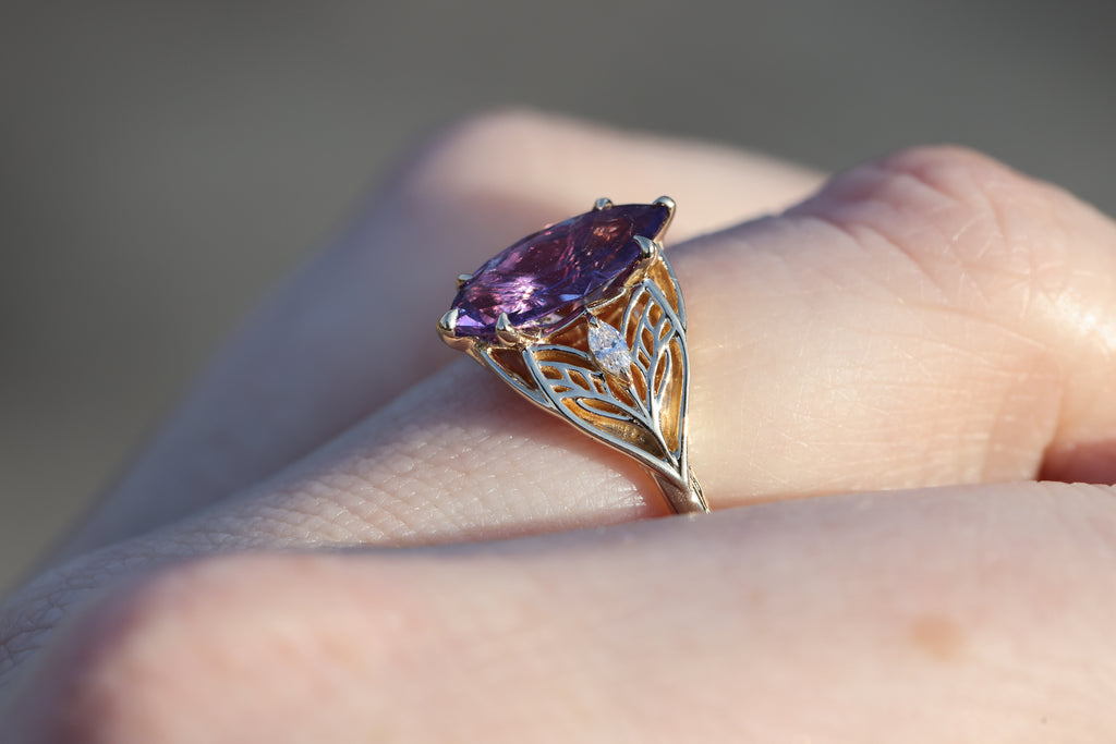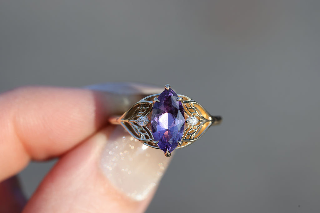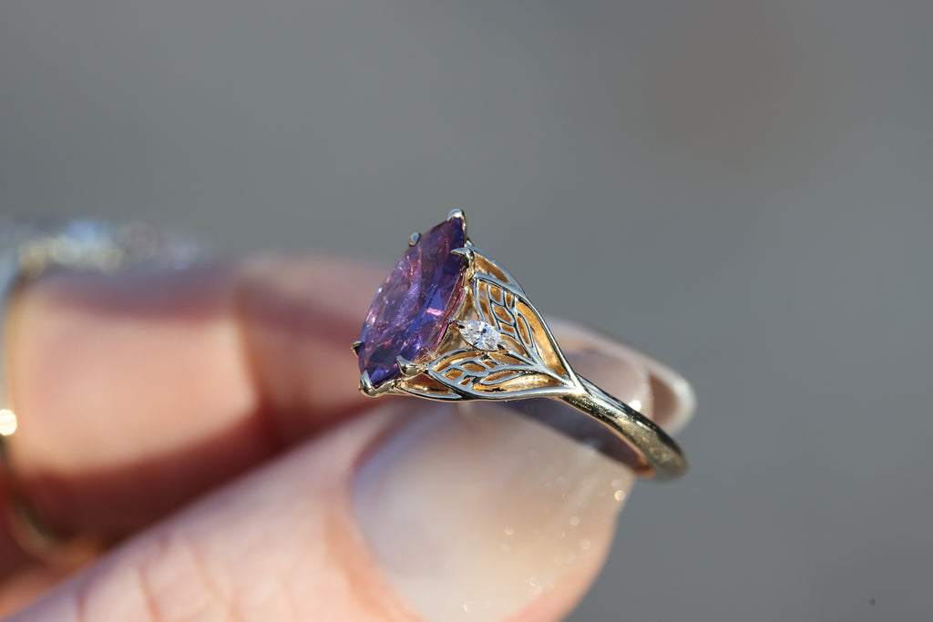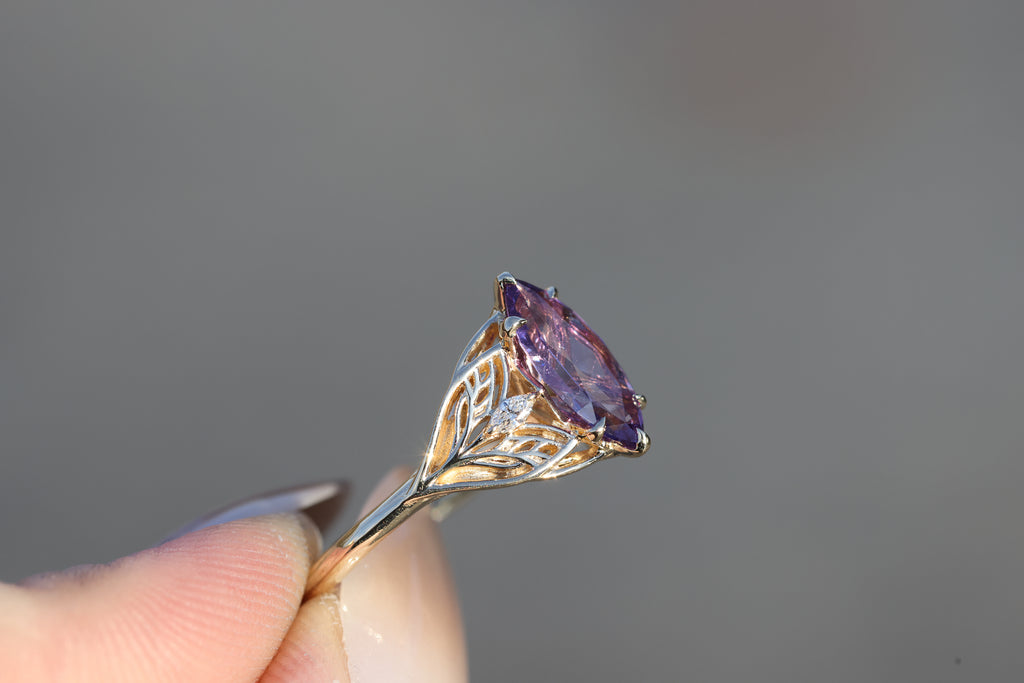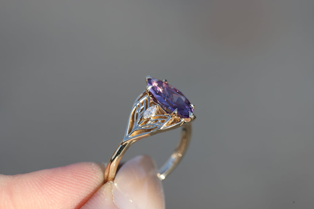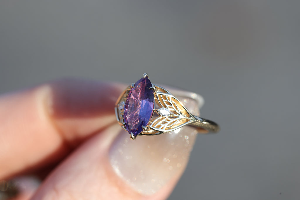 Ready to ship, Size 7 14k yellow Elvindell three stone with marquise purple sapphire