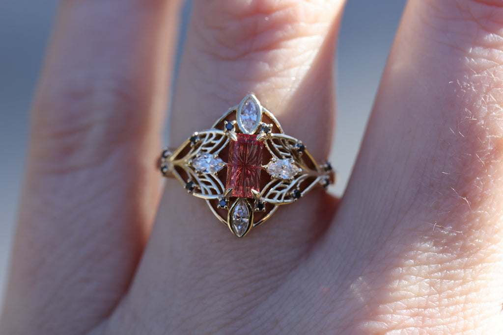 Center: .92ct red orange starbrite sapphire, cut by John Dyer. unheated, 6.8x3.6mm