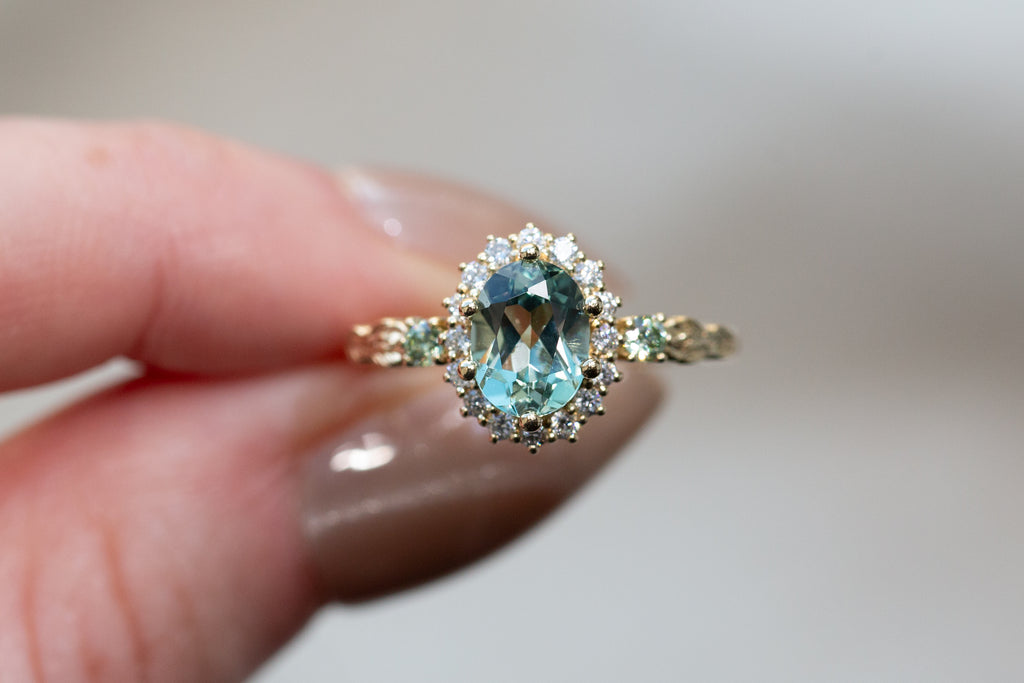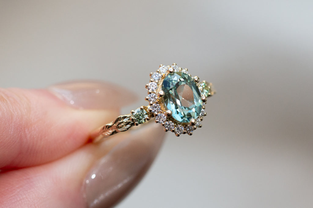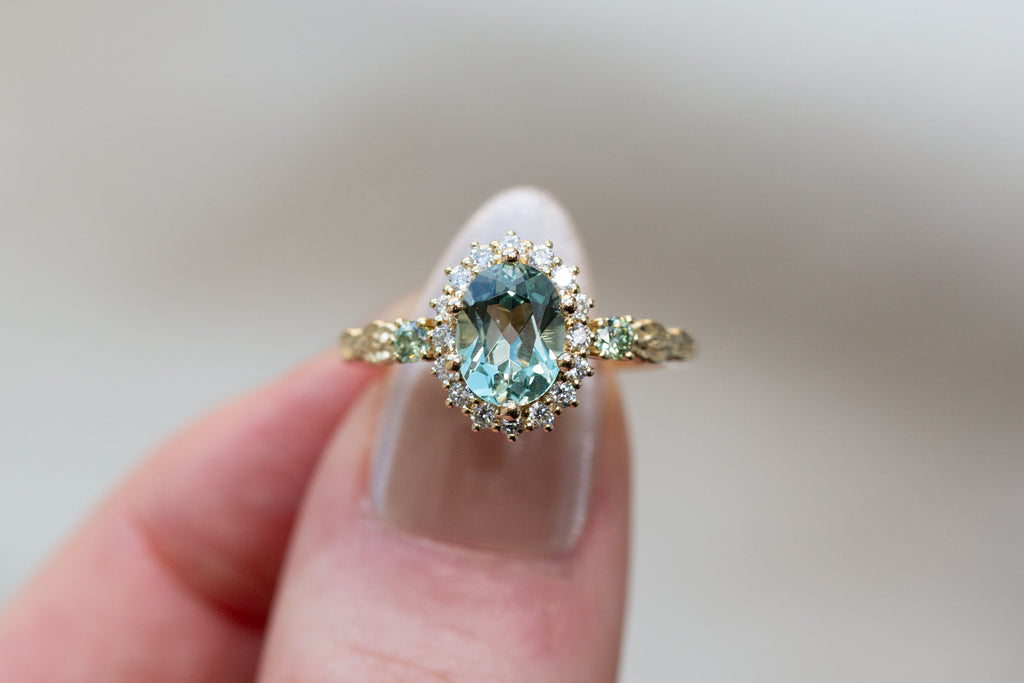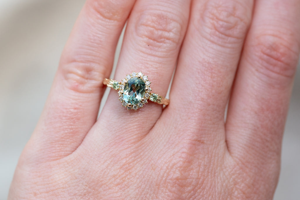 - Side/accents stones: 2.5mm round mint diamond side stones, 1.5mm round lab diamond halo stones