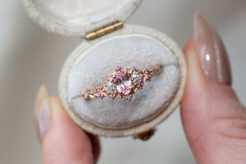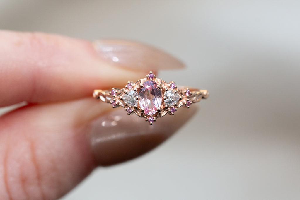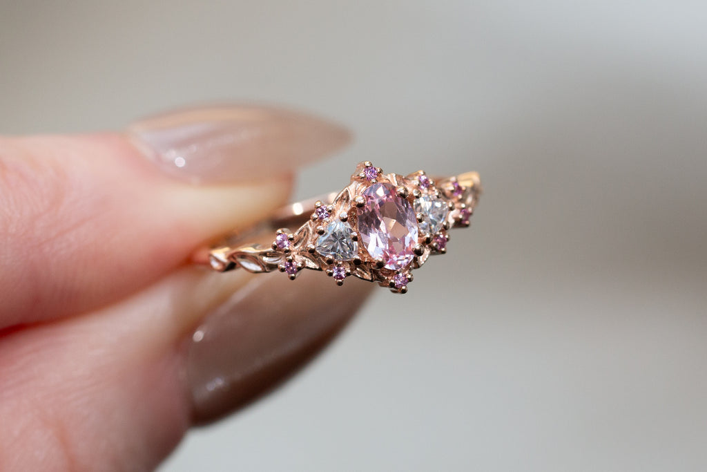 - Side/accents stones: 3mm trillion lab diamond, 1mm round lab pink sapphire