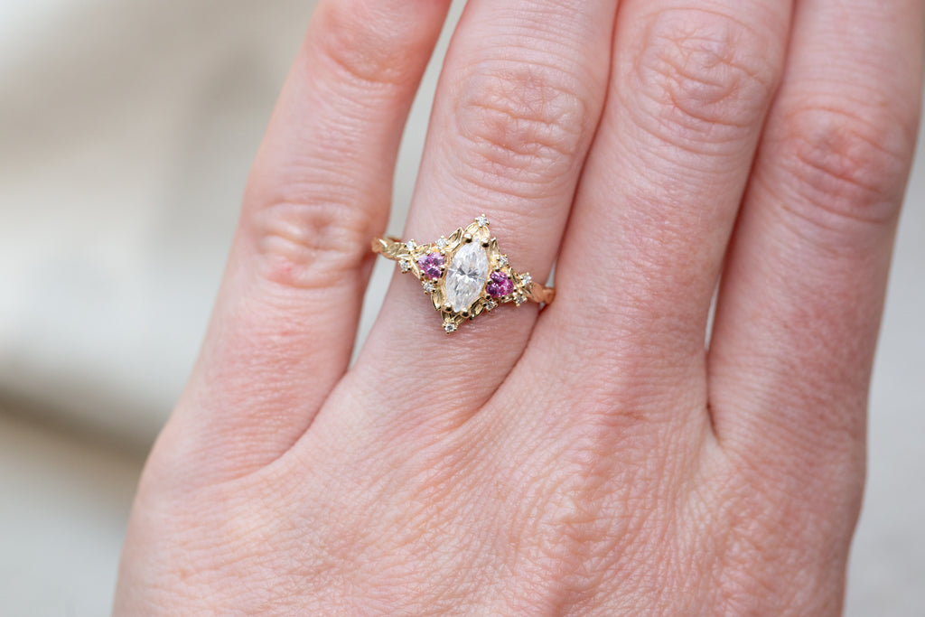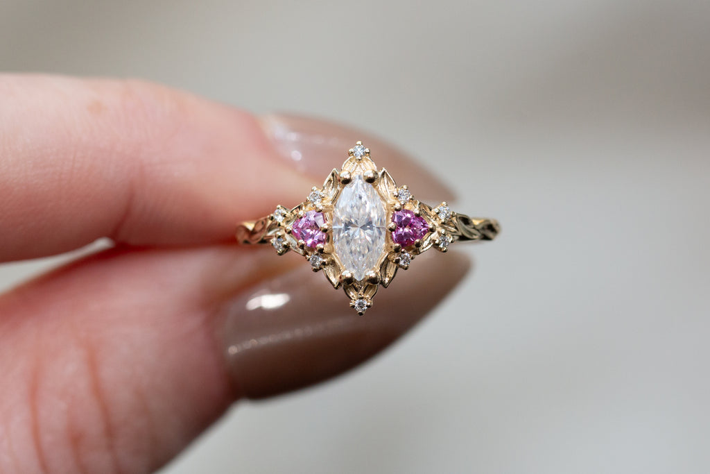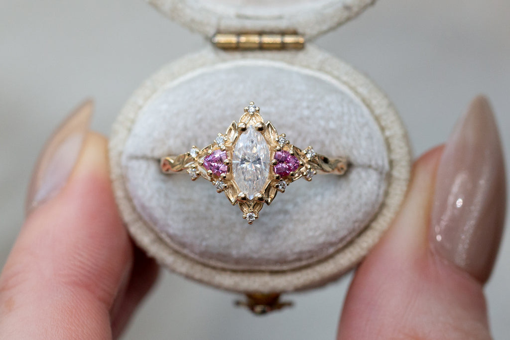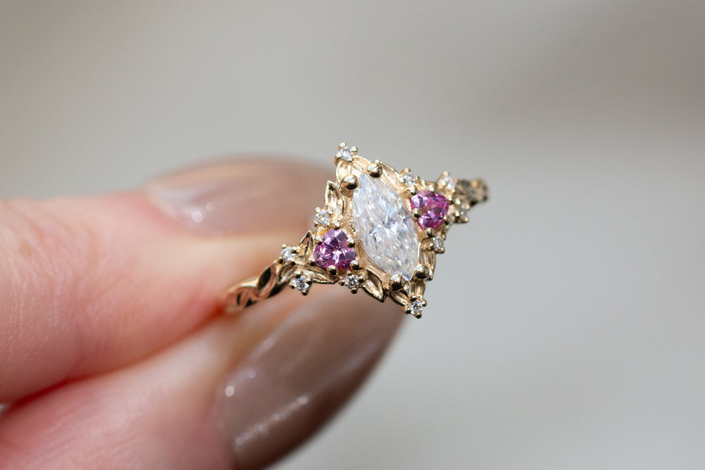 - Side/accents stones: 3mm trillion lab pink sapphire, 1mm round lab diamond