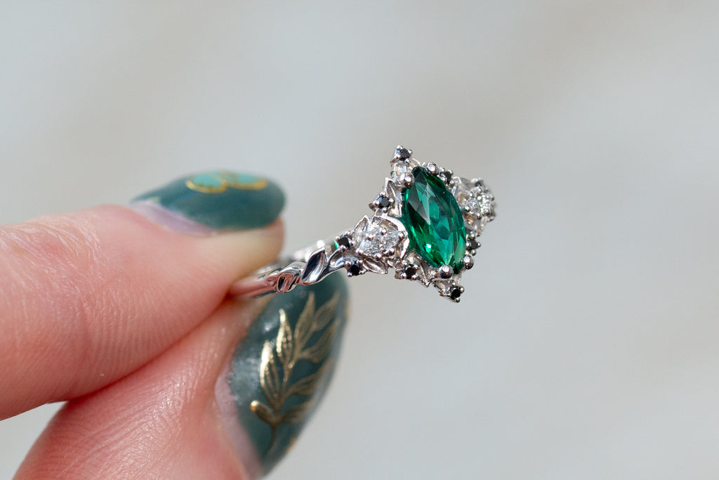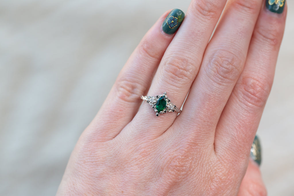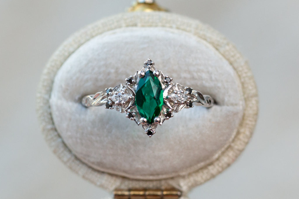 - Center Stone: 8x4mm lab emerald