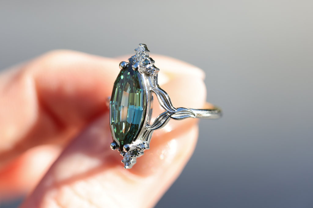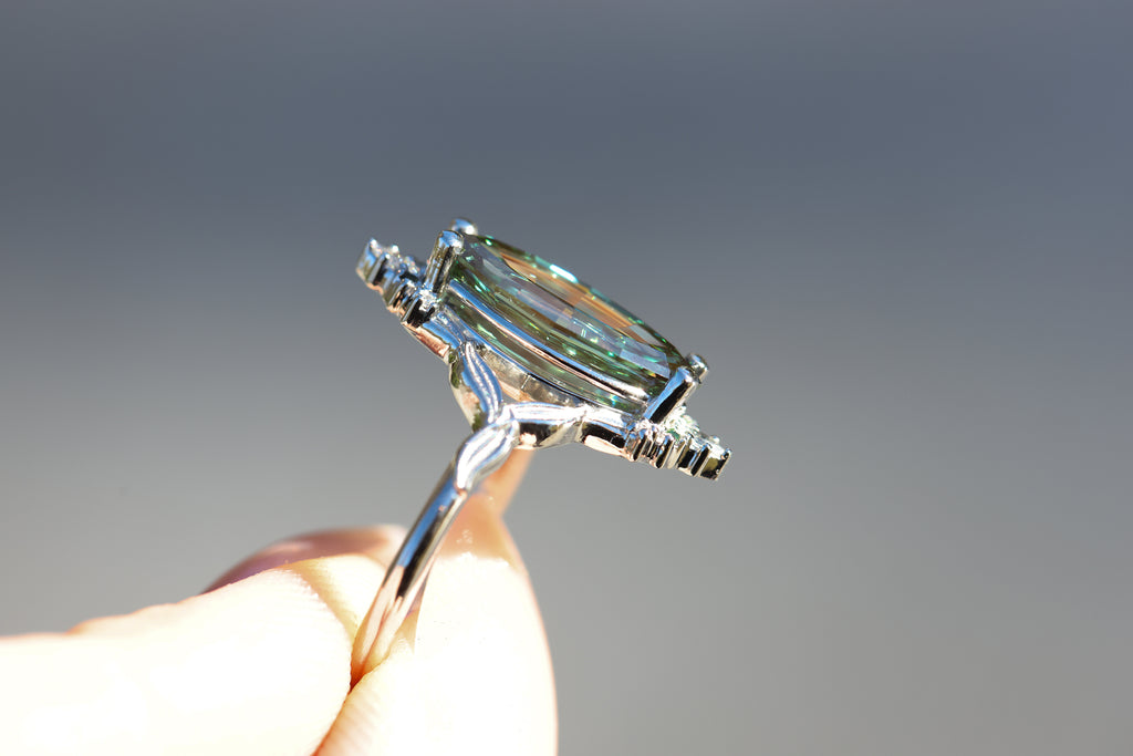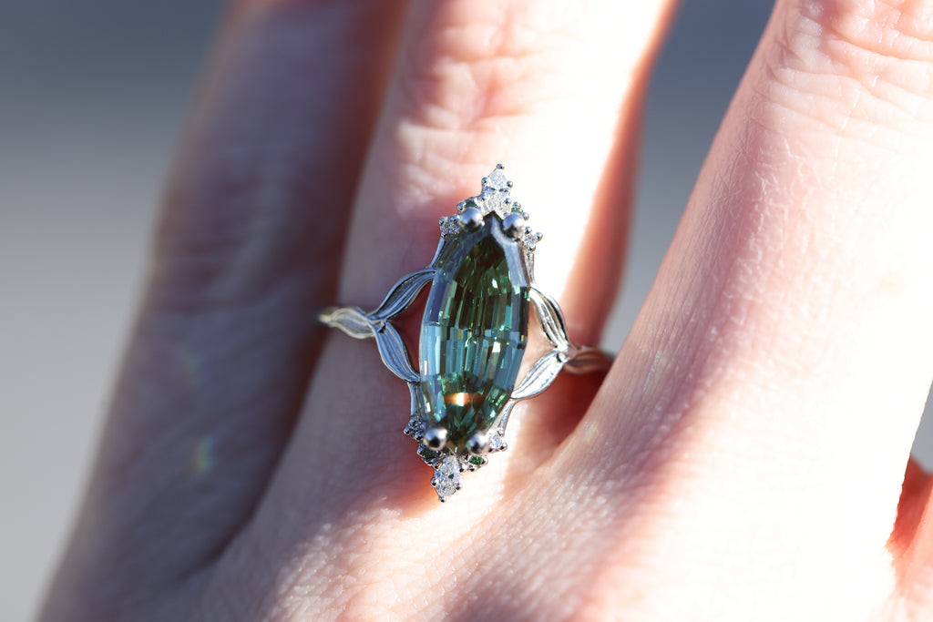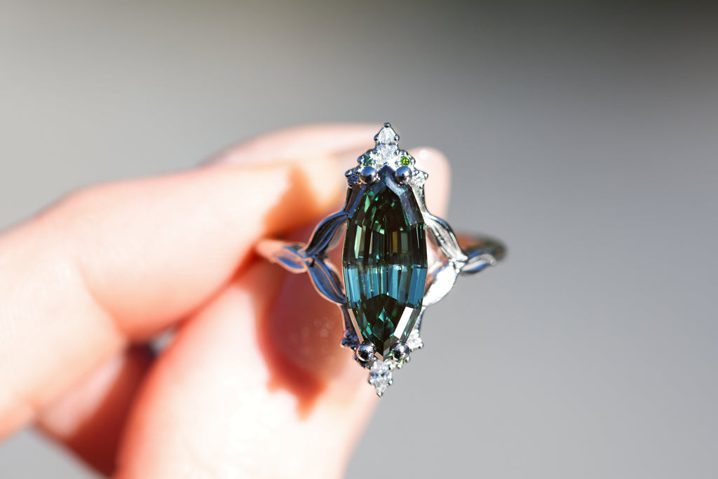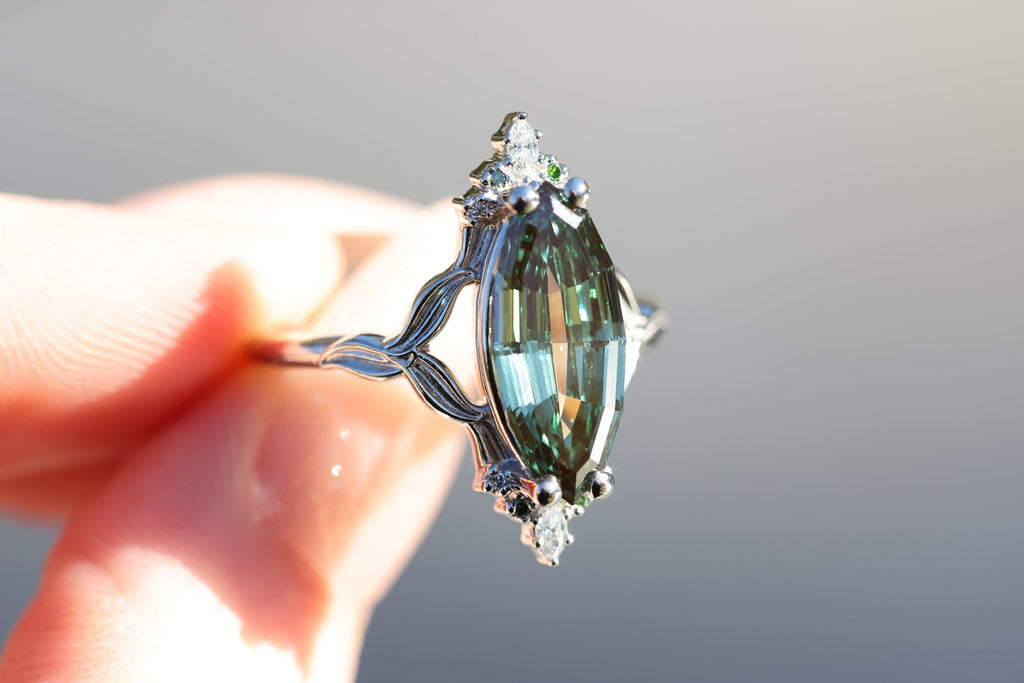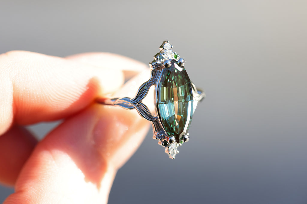 -Side/Accents: 3x1.5mm lab diamonds, 1mm dark green diamonds