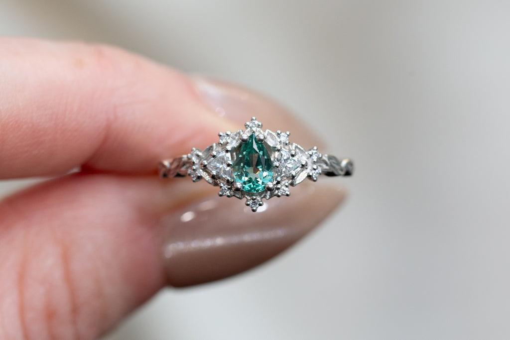 - Side/accent stones: 3mm trillion lab diamond, 1mm round lab diamond