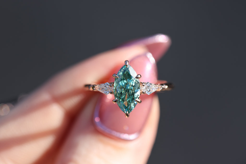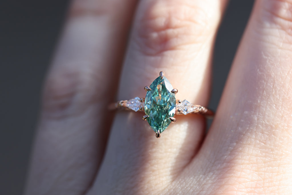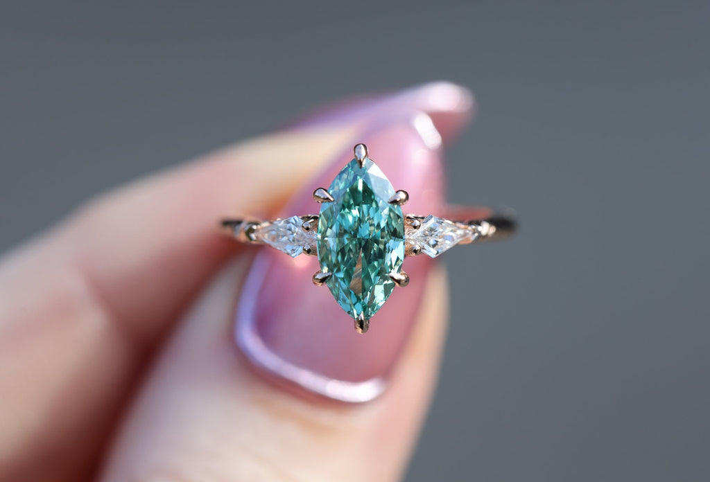 Center: 2.1ct marquise teal diamond 11.78x6.11mm, IGI637451996