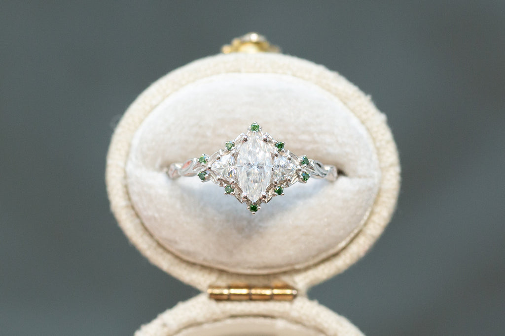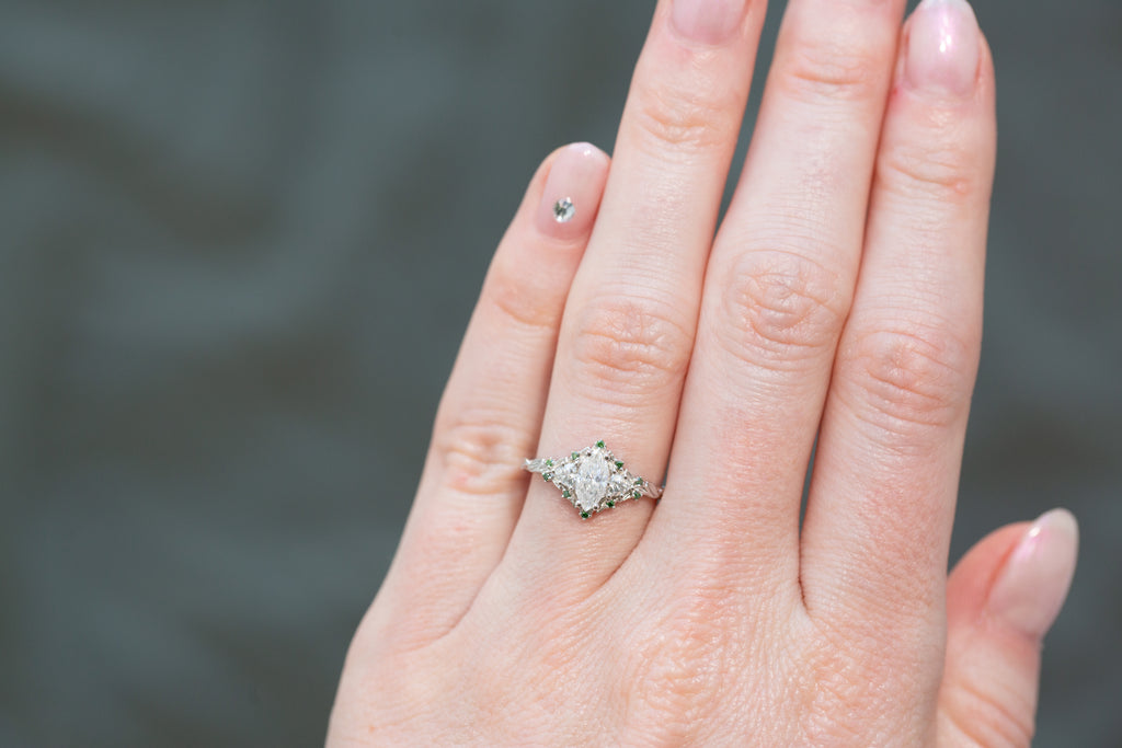 -Side/Accents Stones: 3mm trillion lab diamond, 1mm dark green irradiated diamond