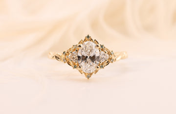 -Side/Accents: 3mm trillion lab diamond, 1mm round mint diamond