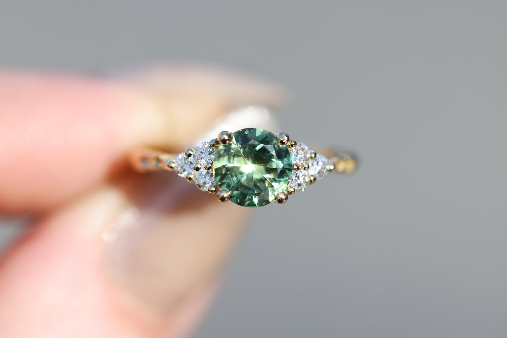 - Six, 2mm round side stones, three on each side of center stone