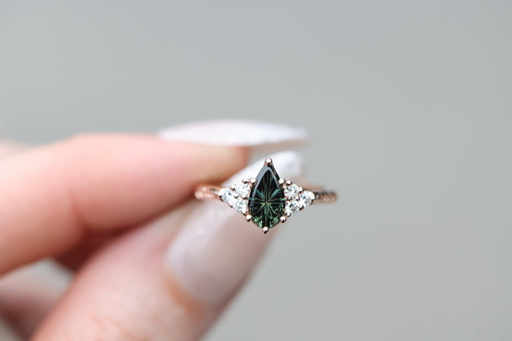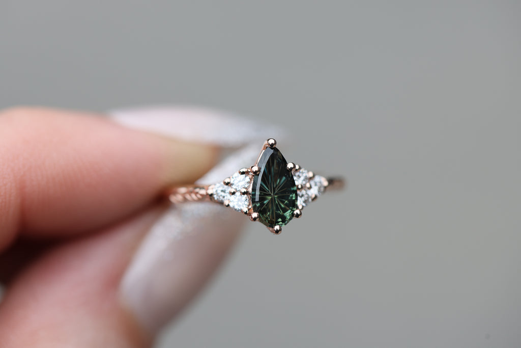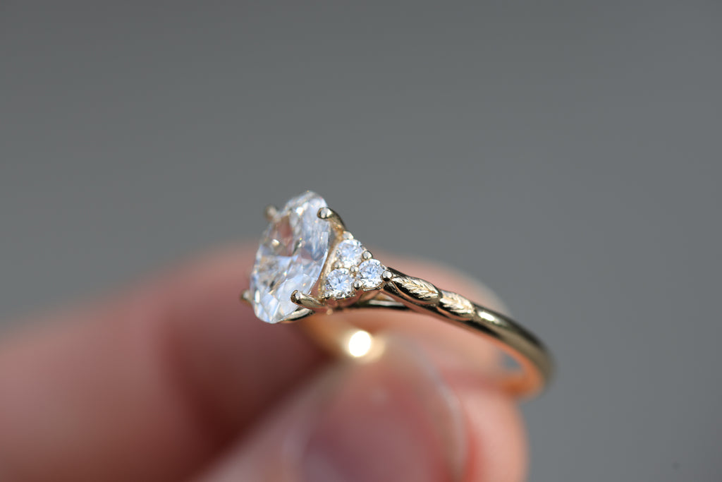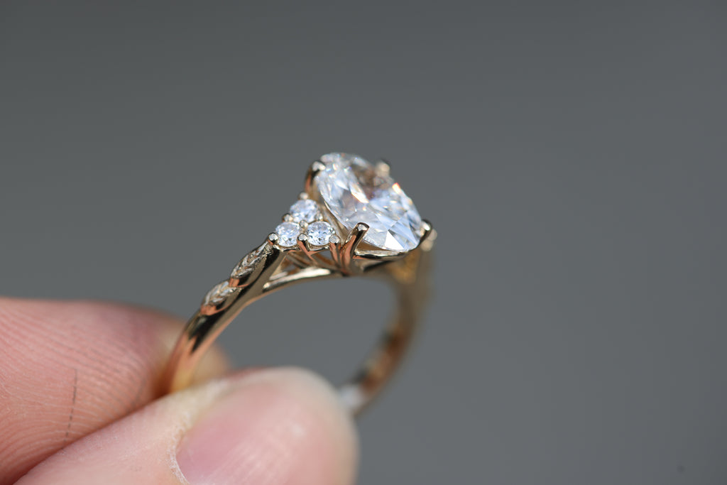 - Pears/marquise center stones will have a slightly different setting from the side because of the extra prong placement. It will still have the open work setting but the band attaches slightly differently.