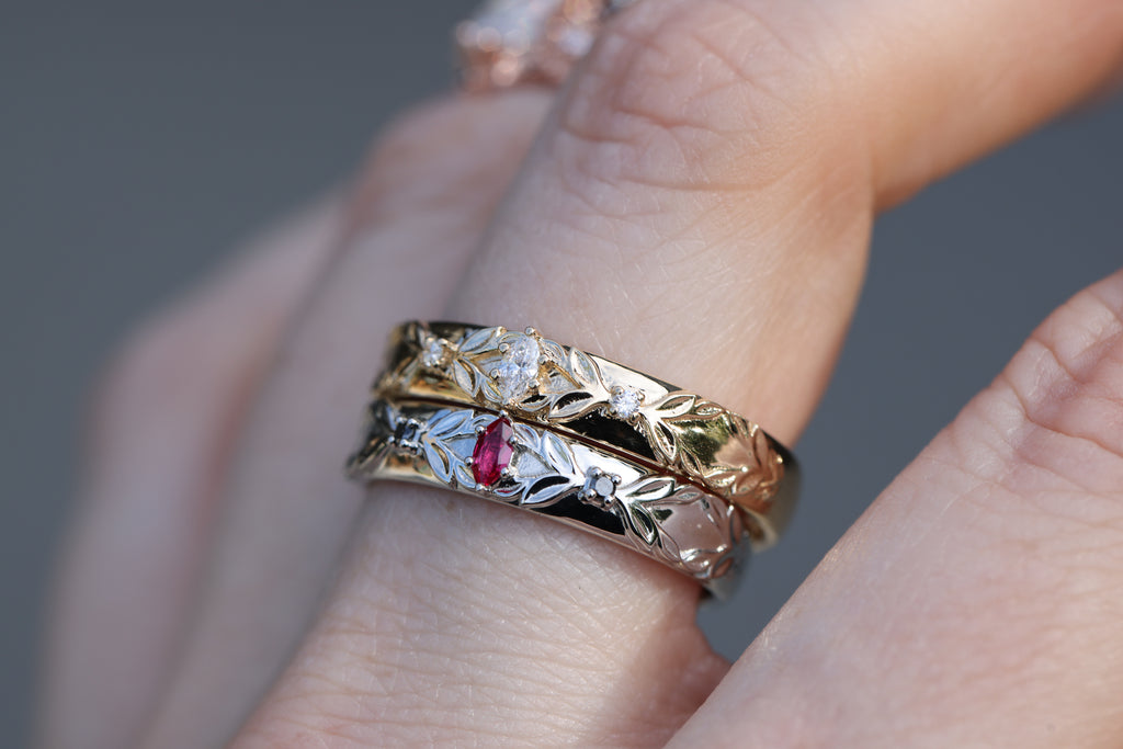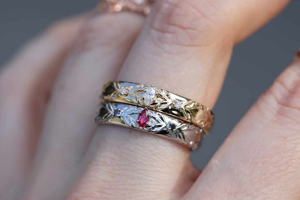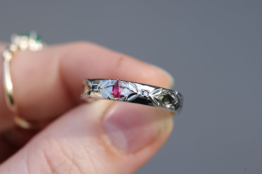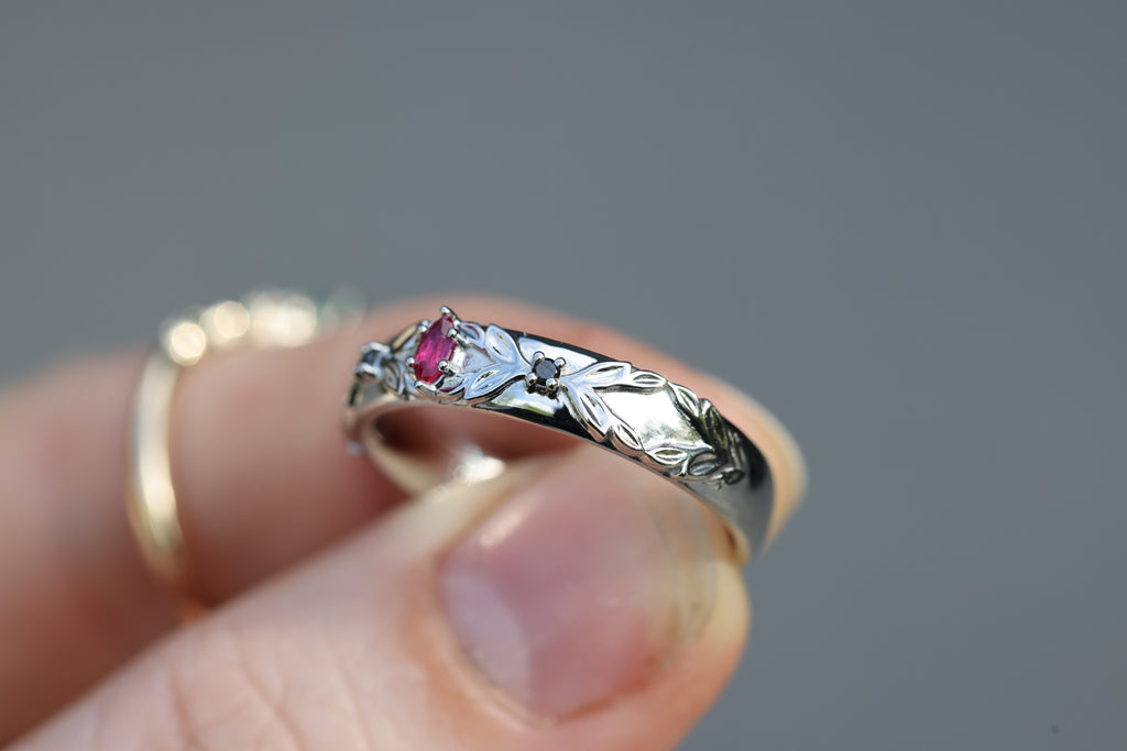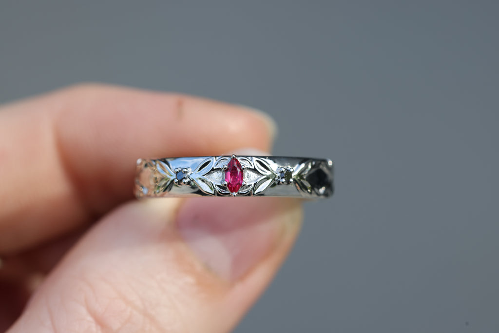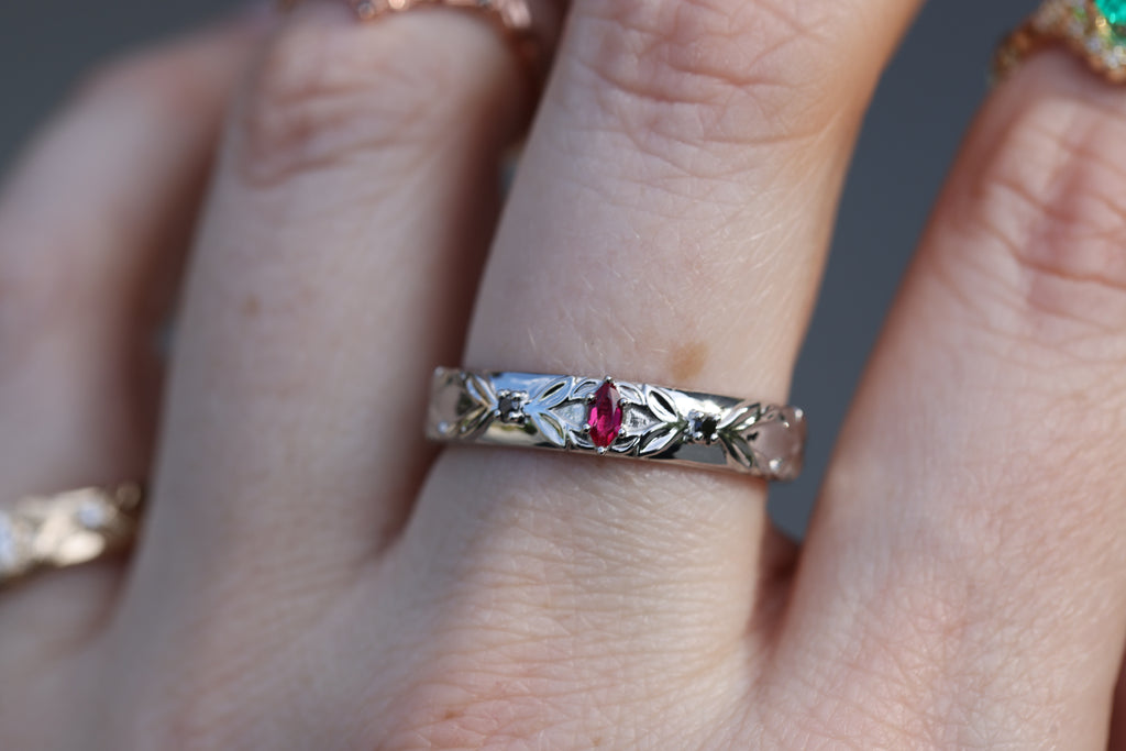 Wide Unisex Briar Band with marquise lab ruby and black diamonds