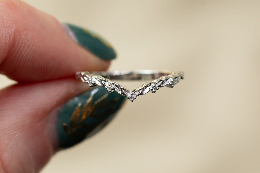 Ready to Ship - Size 8, 14k white gold Chevron Leafy Band with 1.5mm Accents