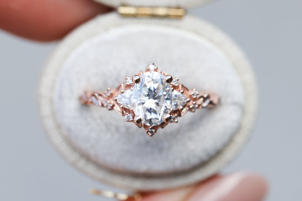 Briar Rose Three Stone with oval moissanite and aqua irradiated diamond accents