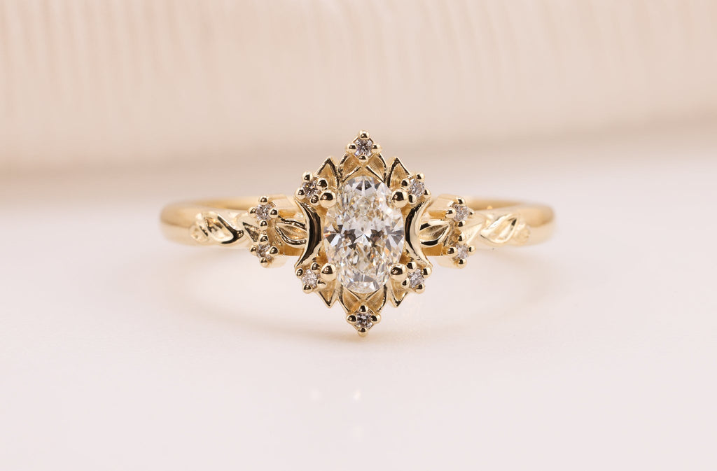 Customize your own Briar Rose Halo Moon with 6x4mm oval center stone