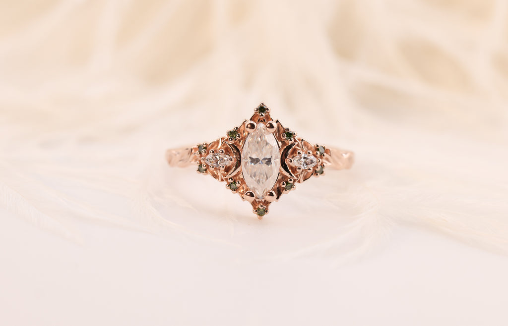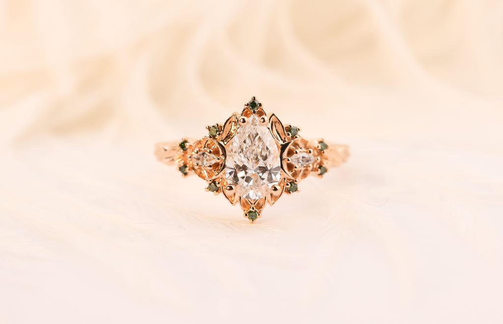 Ready to ship, Size 7 14k rose, Briar rose halo with marquise accents
