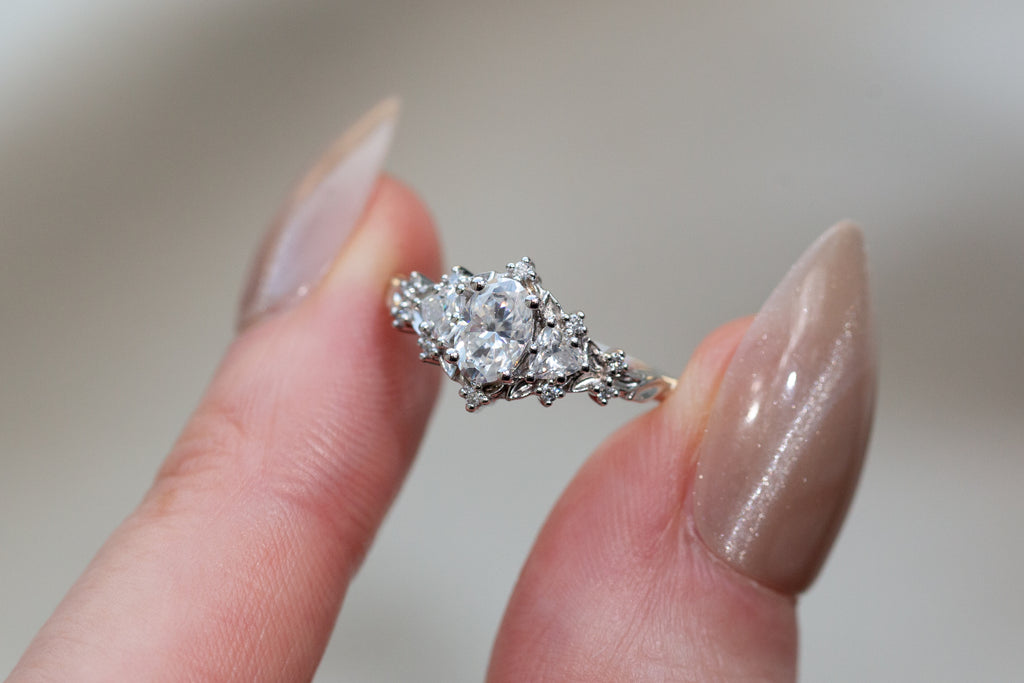 Ready to ship- Size 5, 14k white gold Briar Rose Three Stone