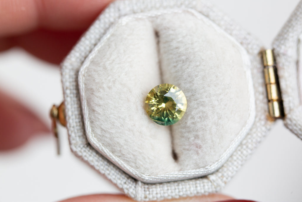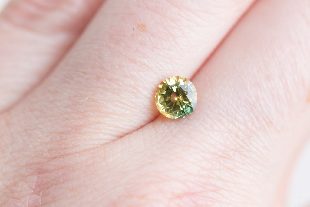 This beautiful one of a kind round sapphire is a green/yellow with unique blue corner and lots of sparkle!