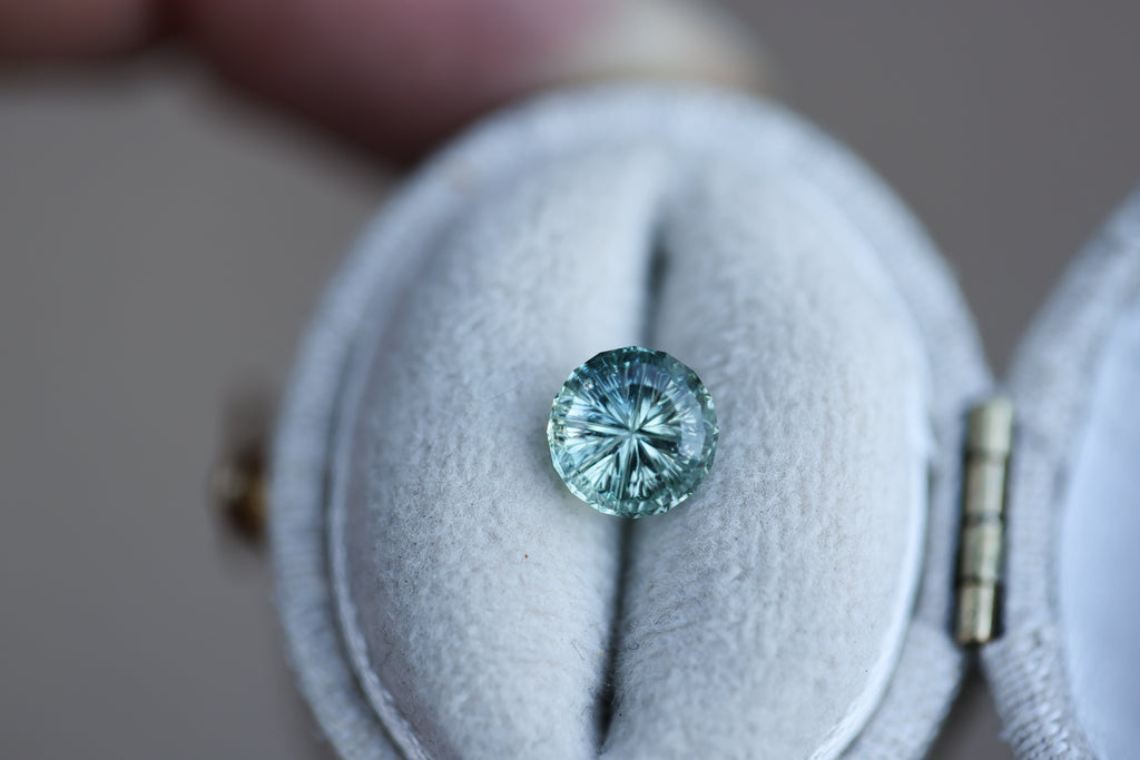 This absolutely stunning round Starbrite cut sapphire has the most gorgeous teal blue coloring! It's custom cut by award winning gem cutter John Dyer makes it such a special stone!