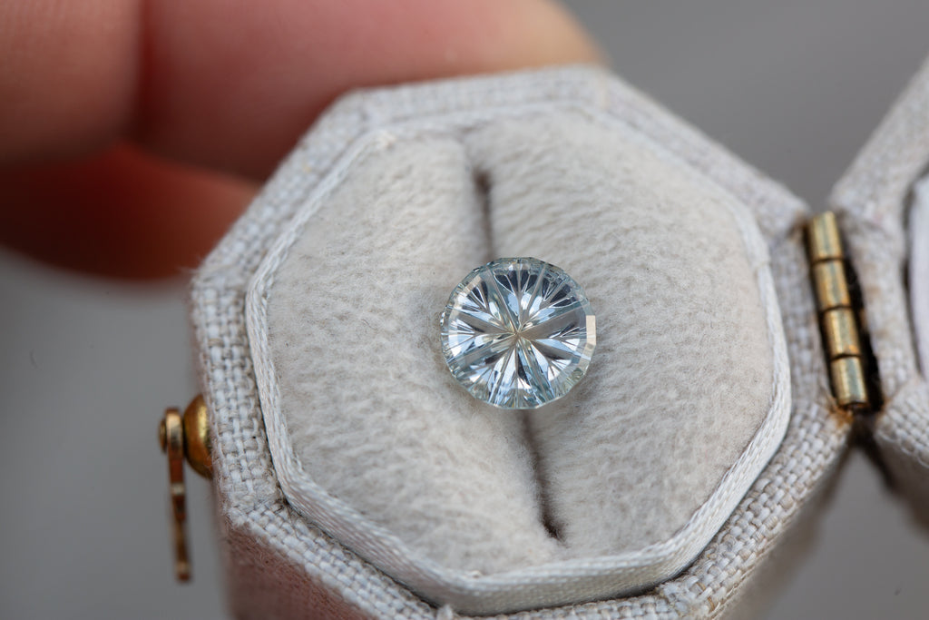 This absolutely magical round Starbrite cut sapphire by award winning gem cutter John Dyer is an icy silver/white with a tiny hint of blue! Such a stunning stone!