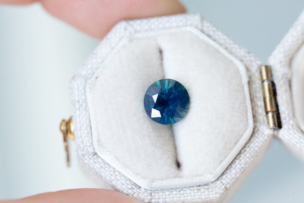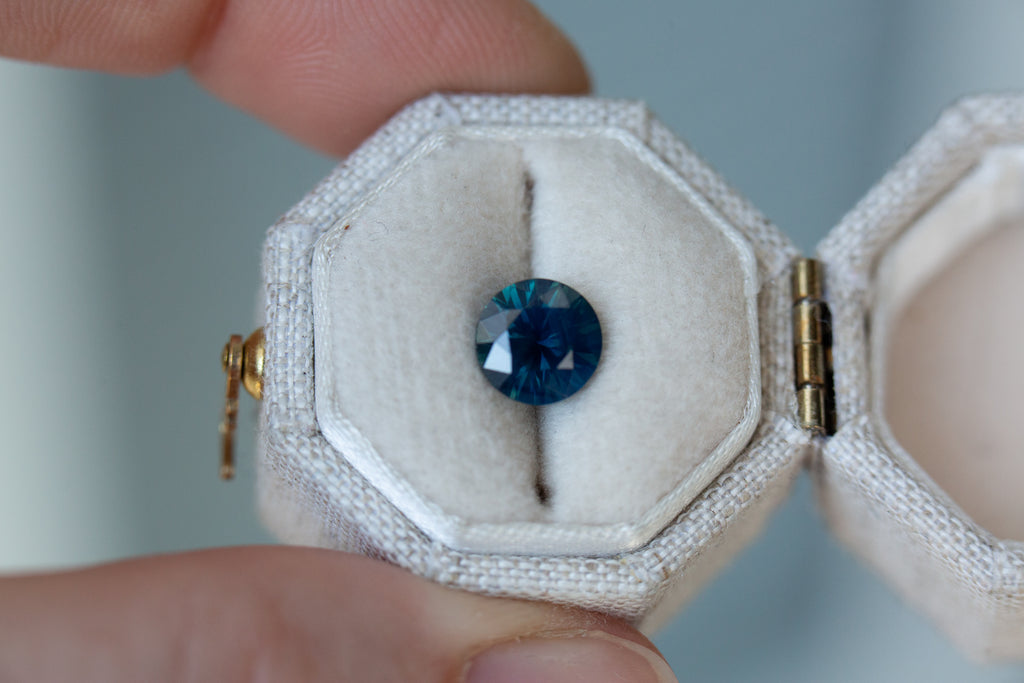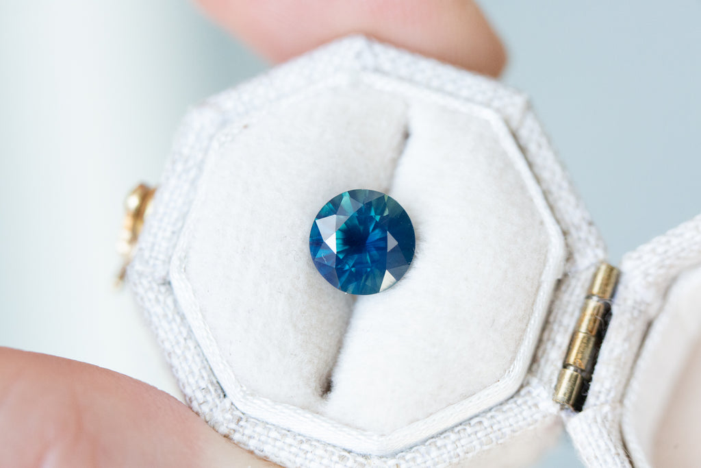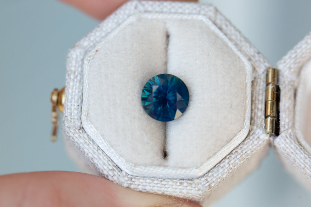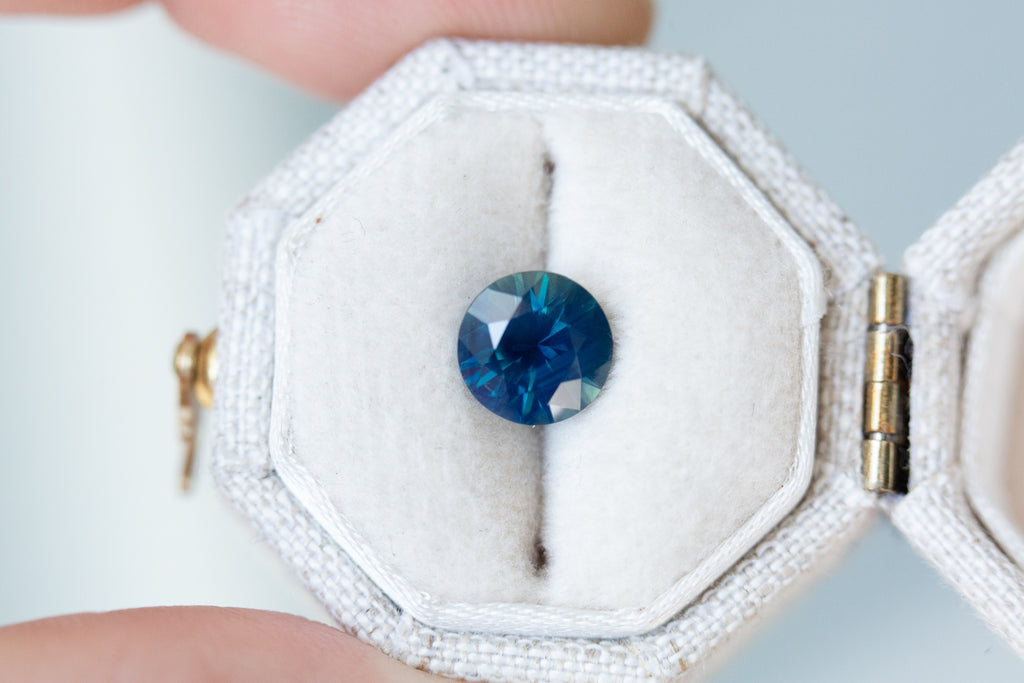 This beautiful blue green sapphire has such deep rich blues that lighten throughout the facets with pops of green and opalescence to make such a stunning unique stone.