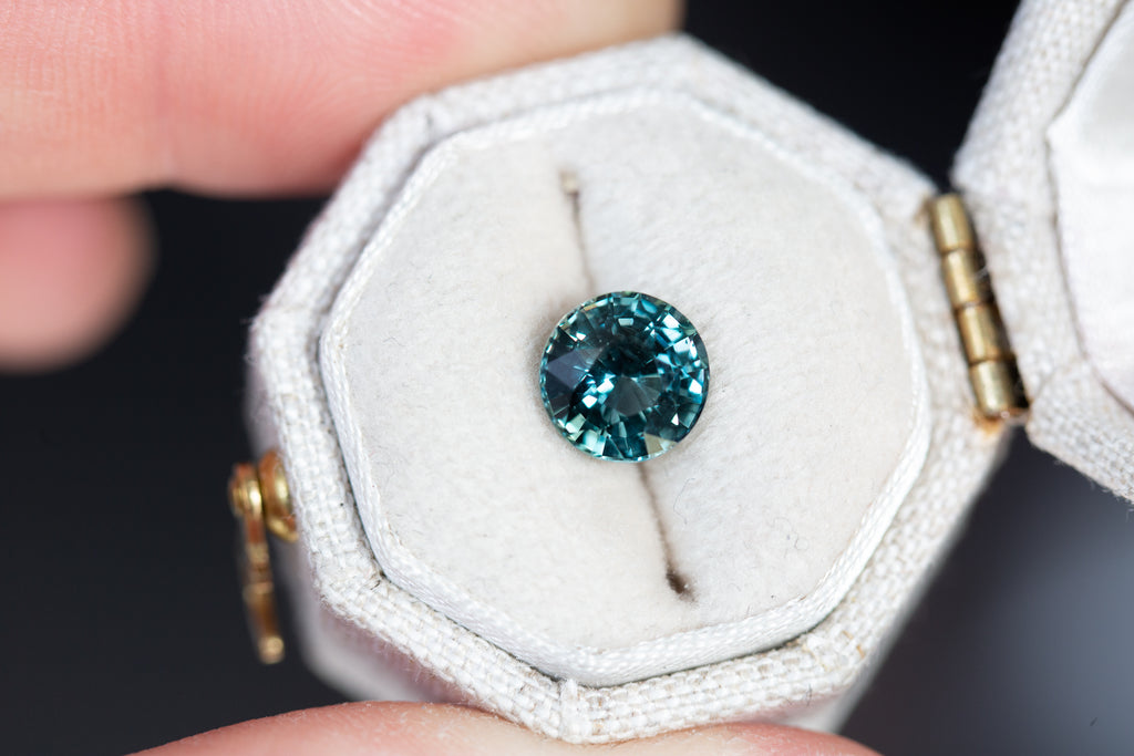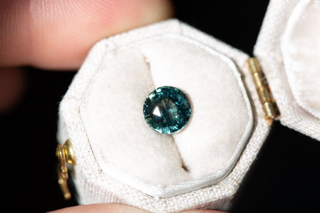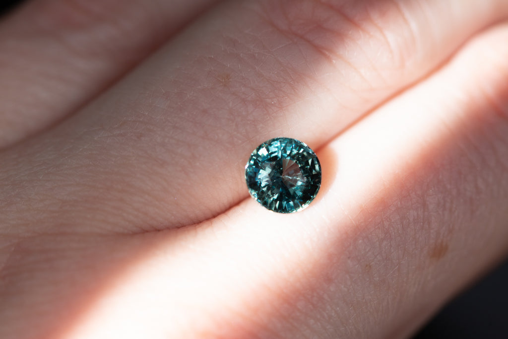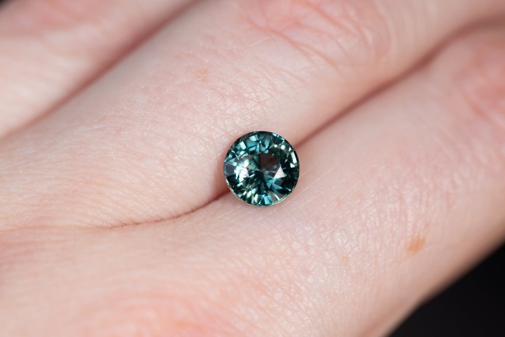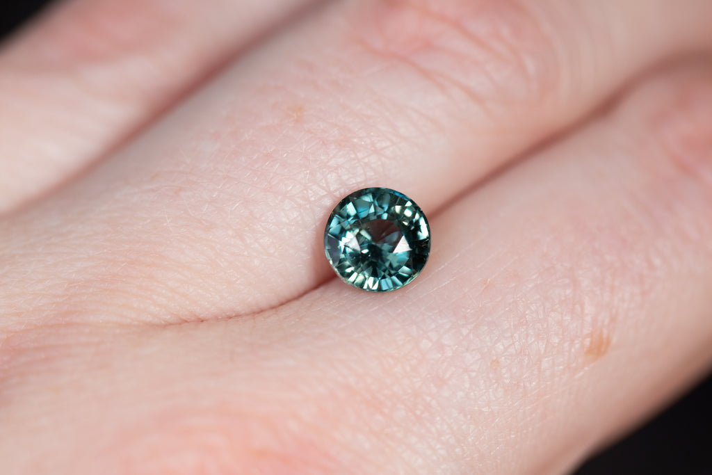 This gorgeous round teal blue sapphire color shifts to a greyish hue in some incandescent lighting and has some absolutely stunning faceting for such brilliant sparkle!