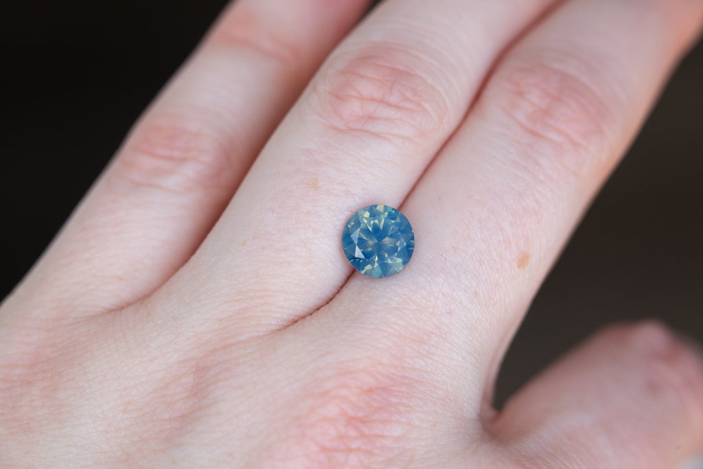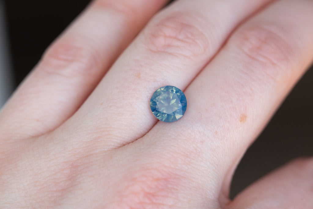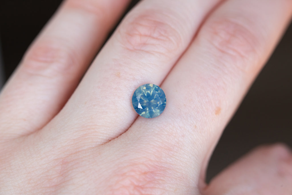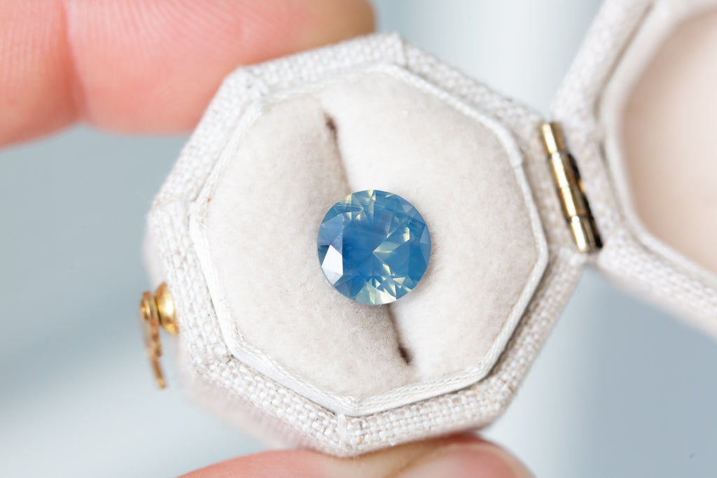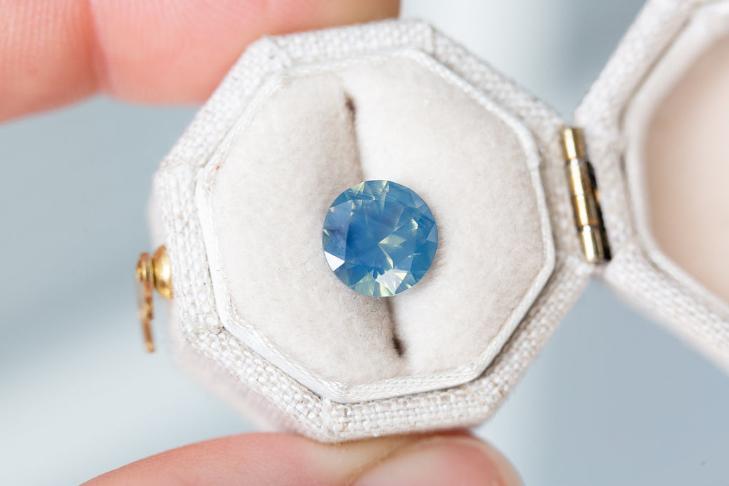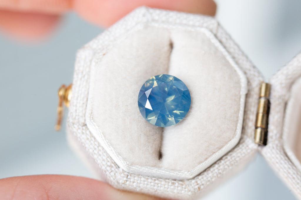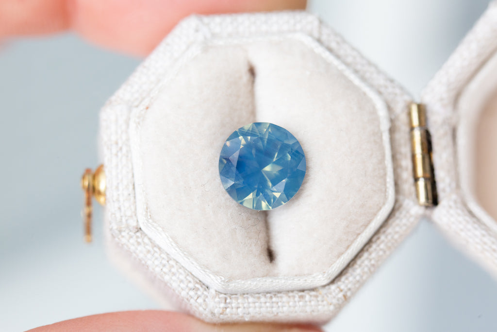 A beautiful opalescent sky blue, it's almost like the sun is peaking through as light hits the facets. This stunning round sapphire is extremely unique and rare and will make a one of a kind statement piece.