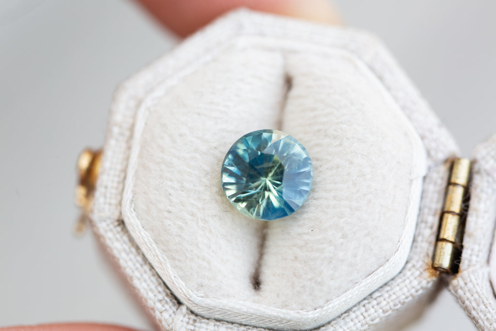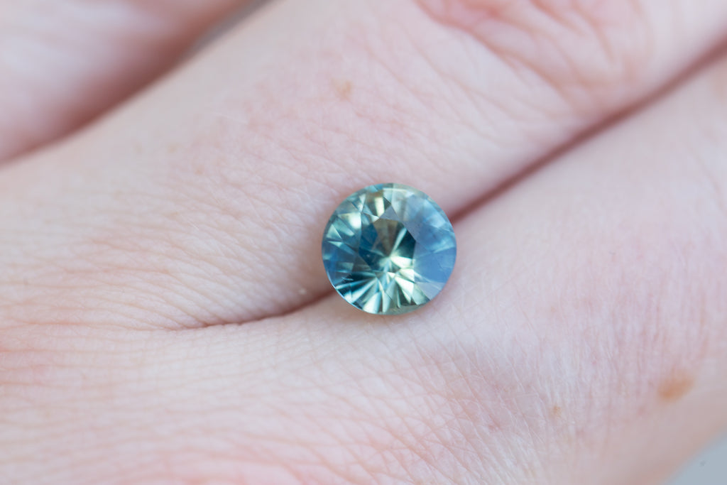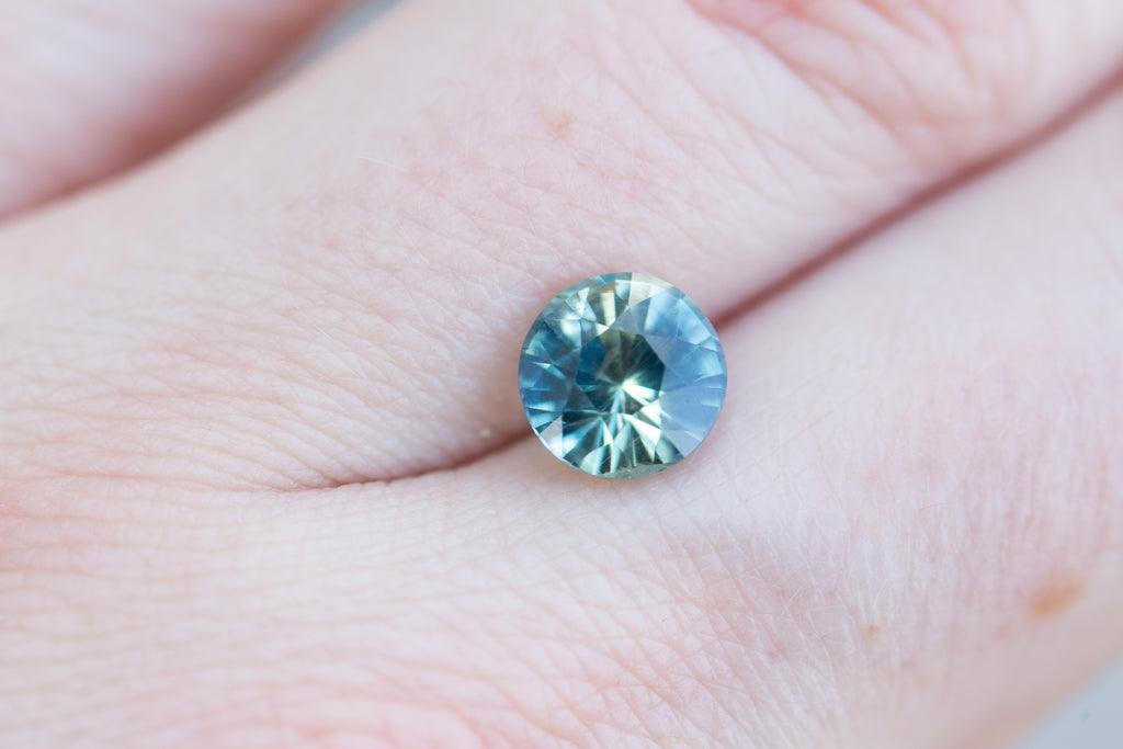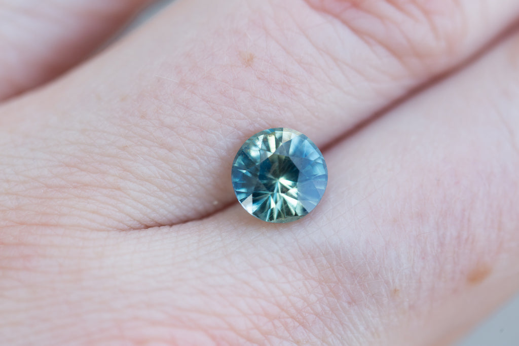 This absolutely stunning round teal blue sapphire has such unique color zoning - it is just a gorgeous stone!